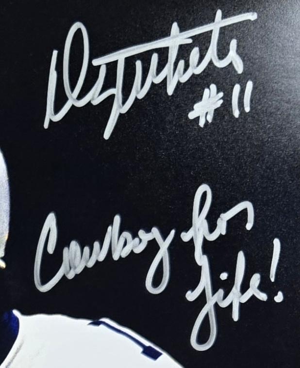 Photo measures 11" x 14" in size and is hand-signed and inscribed by Danny White (Dallas Cowboys).