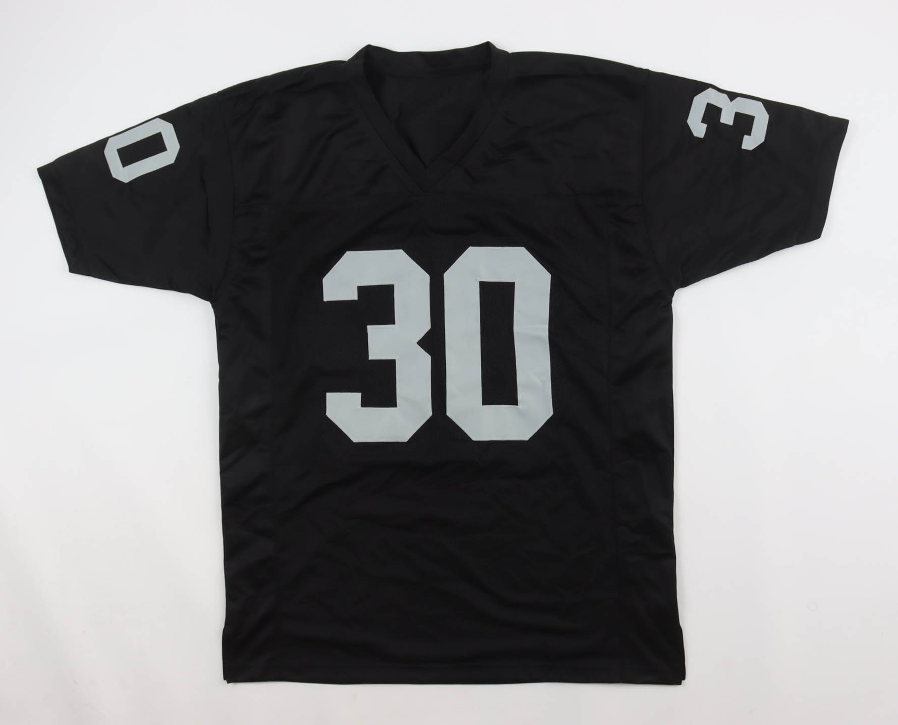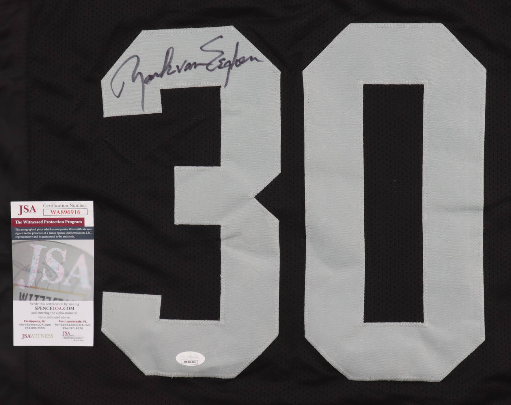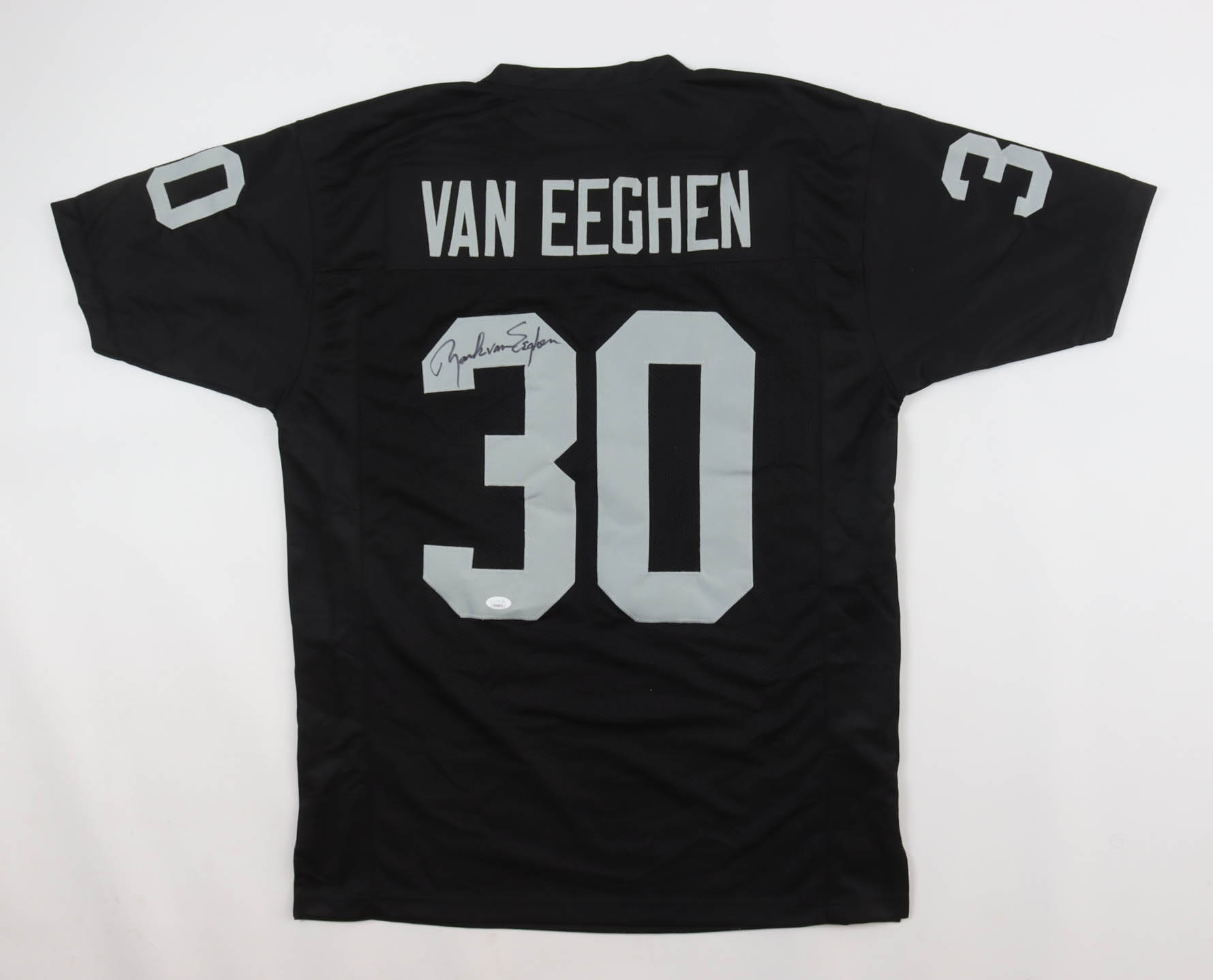 Custom jersey with everything sewn on, size XL. Hand-signed by Mark Van Eeghen (Oakland Raiders).
