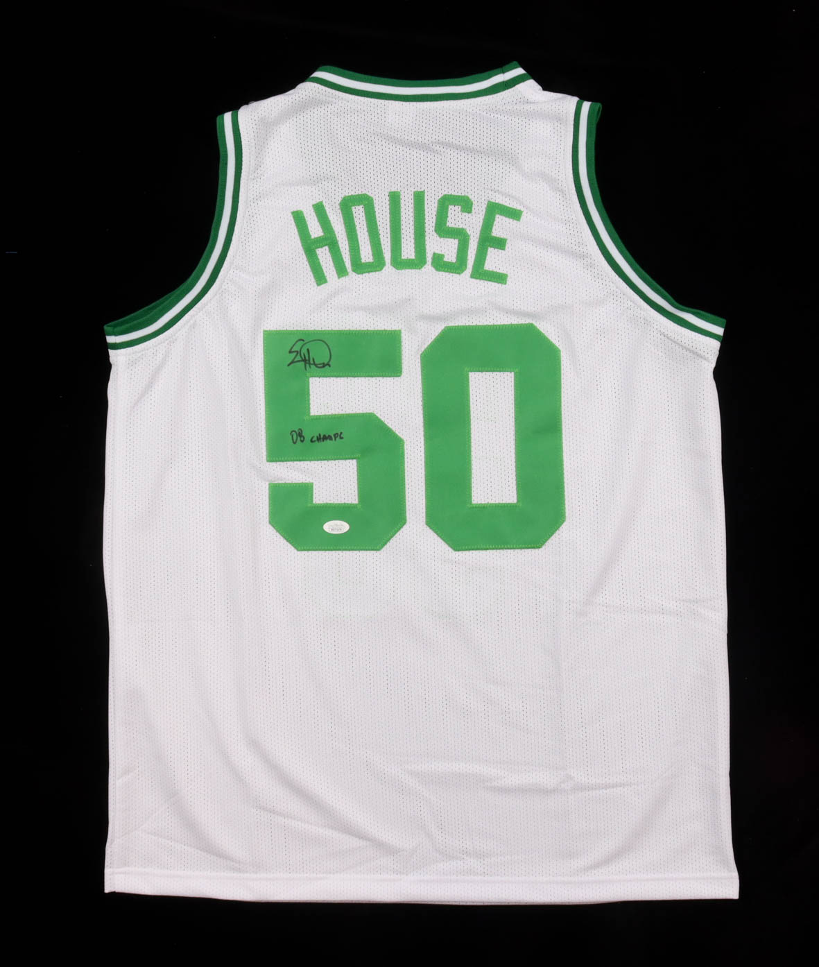 Custom jersey with everything sewn on, size XL. Hand-signed and inscribed by Eddie House (Boston Celtics).