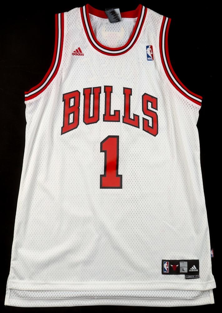 Adidas authentic jersey with everything pressed on, size L. Hand-signed by Derrick Rose (Chicago Bulls).