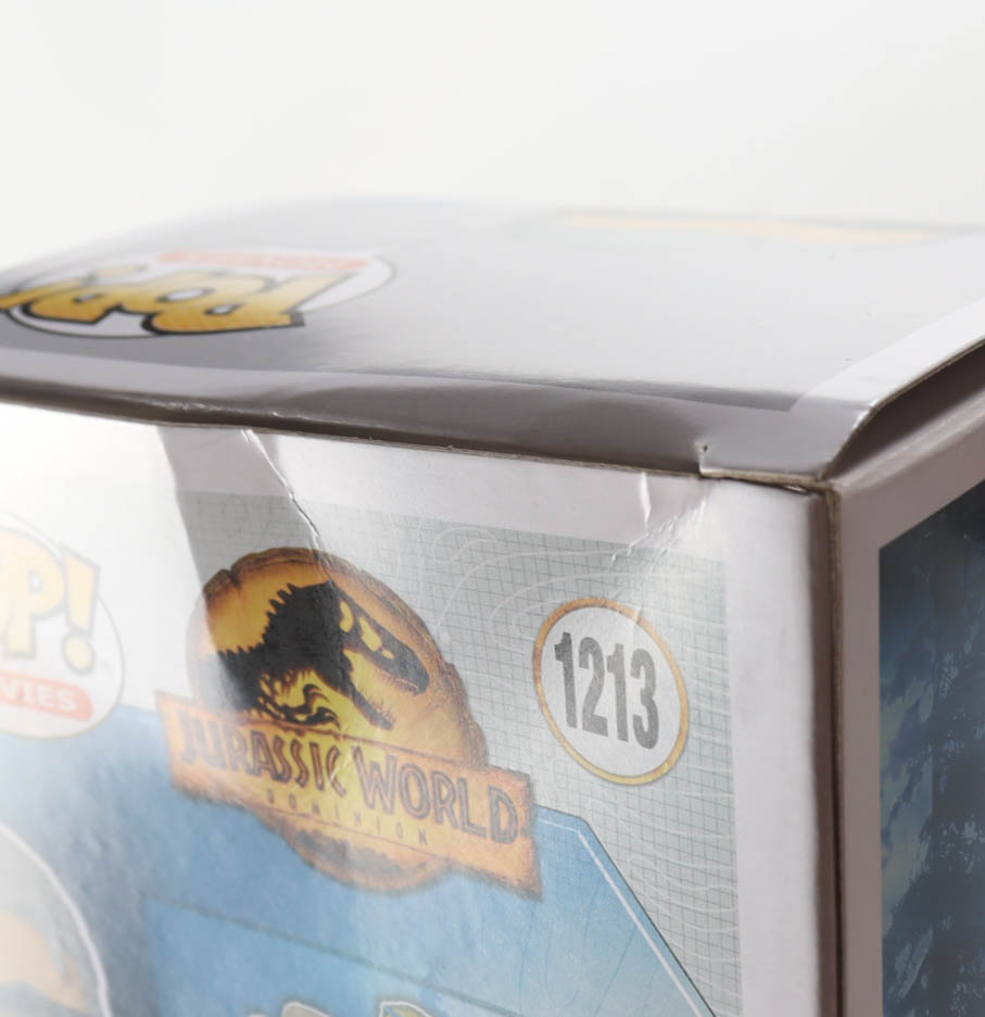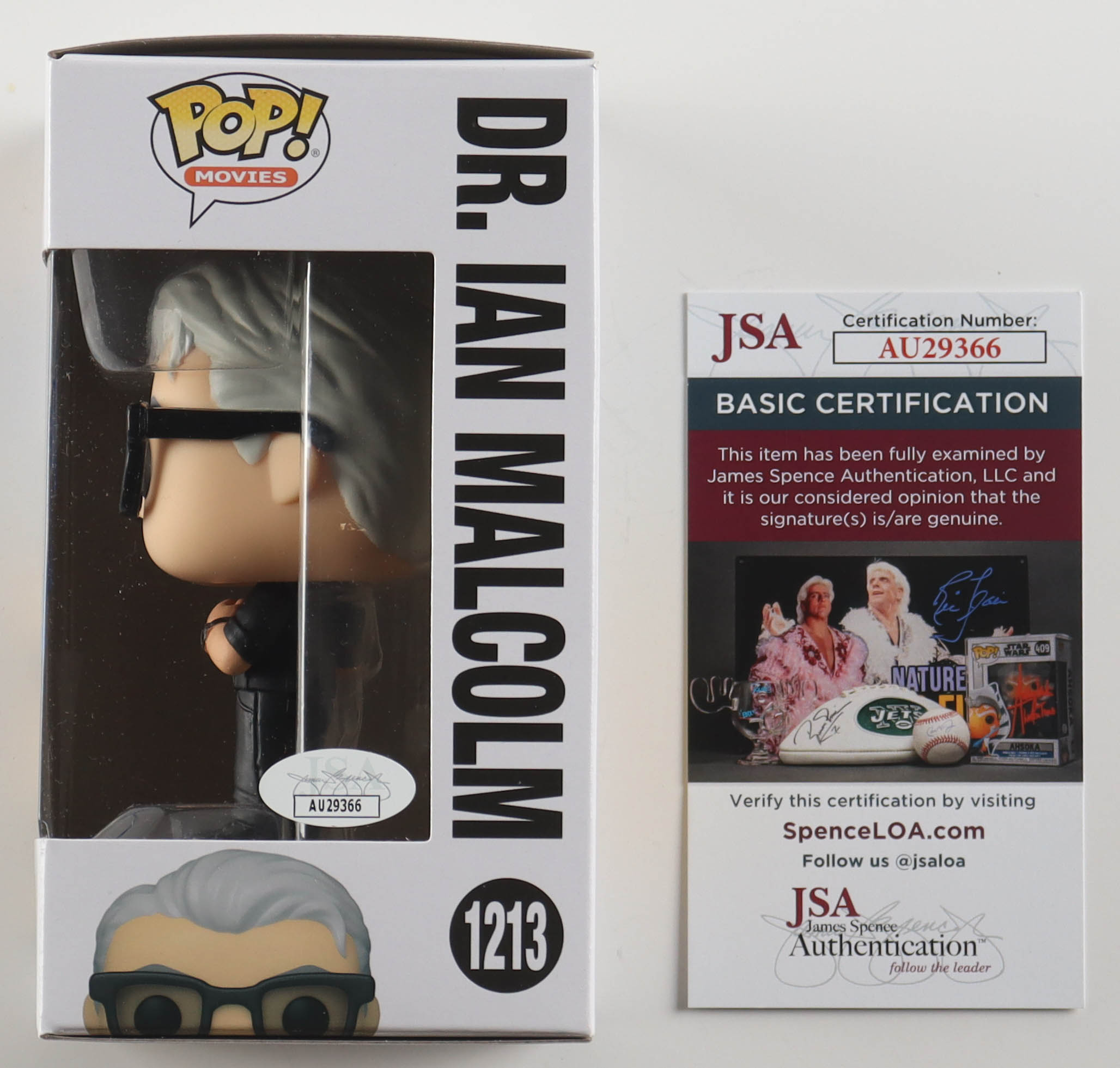 Funko Pop! figure measures approximately 4" tall. Hand-signed on the packaging by Jeff Goldblum. Please note the window has been swapped and the back of the packaging is dented in.
