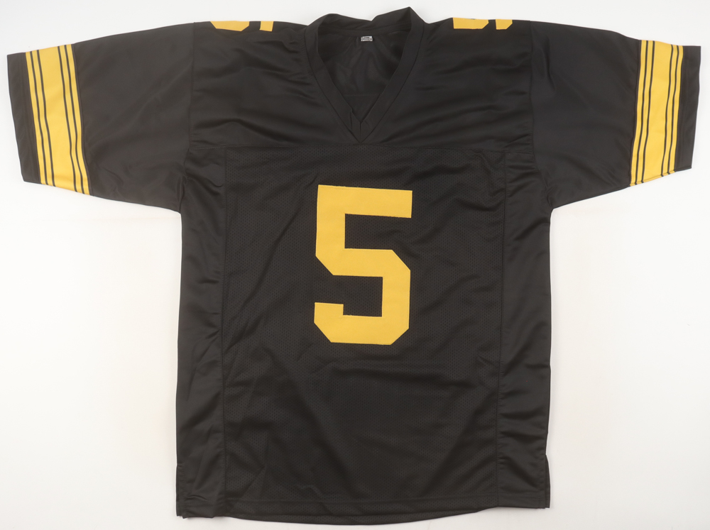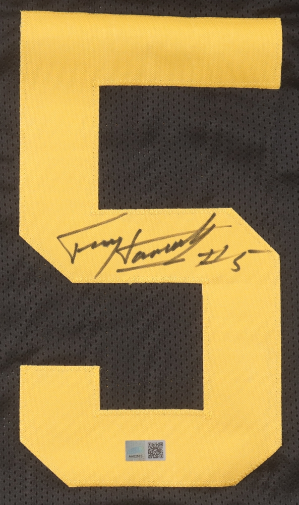 Custom jersey with everything sewn on, size XL. Hand-signed and inscribed by Terry Hanratty.