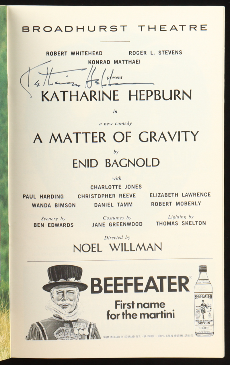 "A Matter Of Gravity" Playbill has been hand-signed on an inside page by Katharine Hepburn (D. 2003).