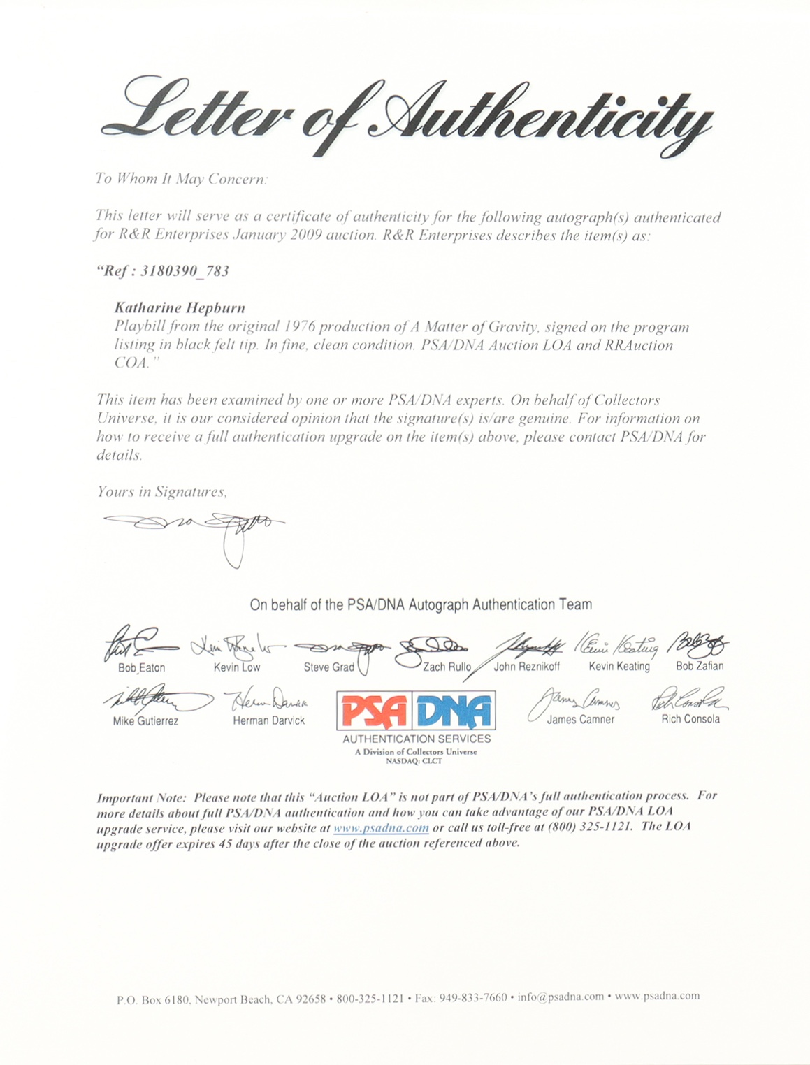 Katharine Hepburn Signed "A Matter Of Gravity" Playbill (PSA)