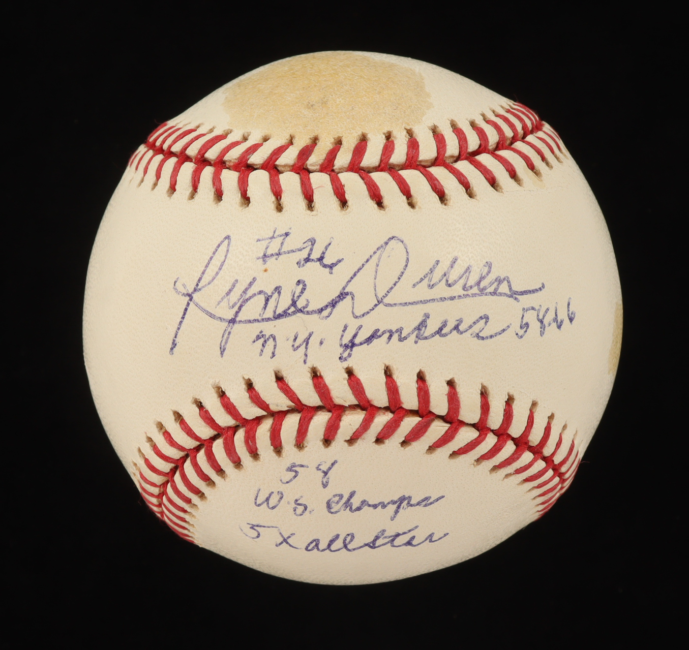 Rawlings Official Major League baseball. Has been hand-signed and inscribed by Ryne Duren (New York Yankees). Please note, ball has been stained and naturally toned.