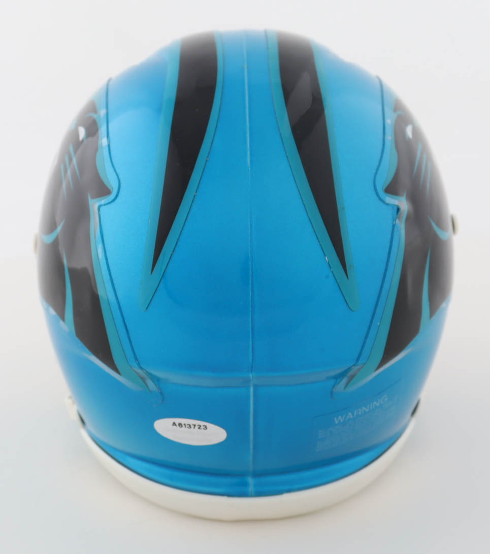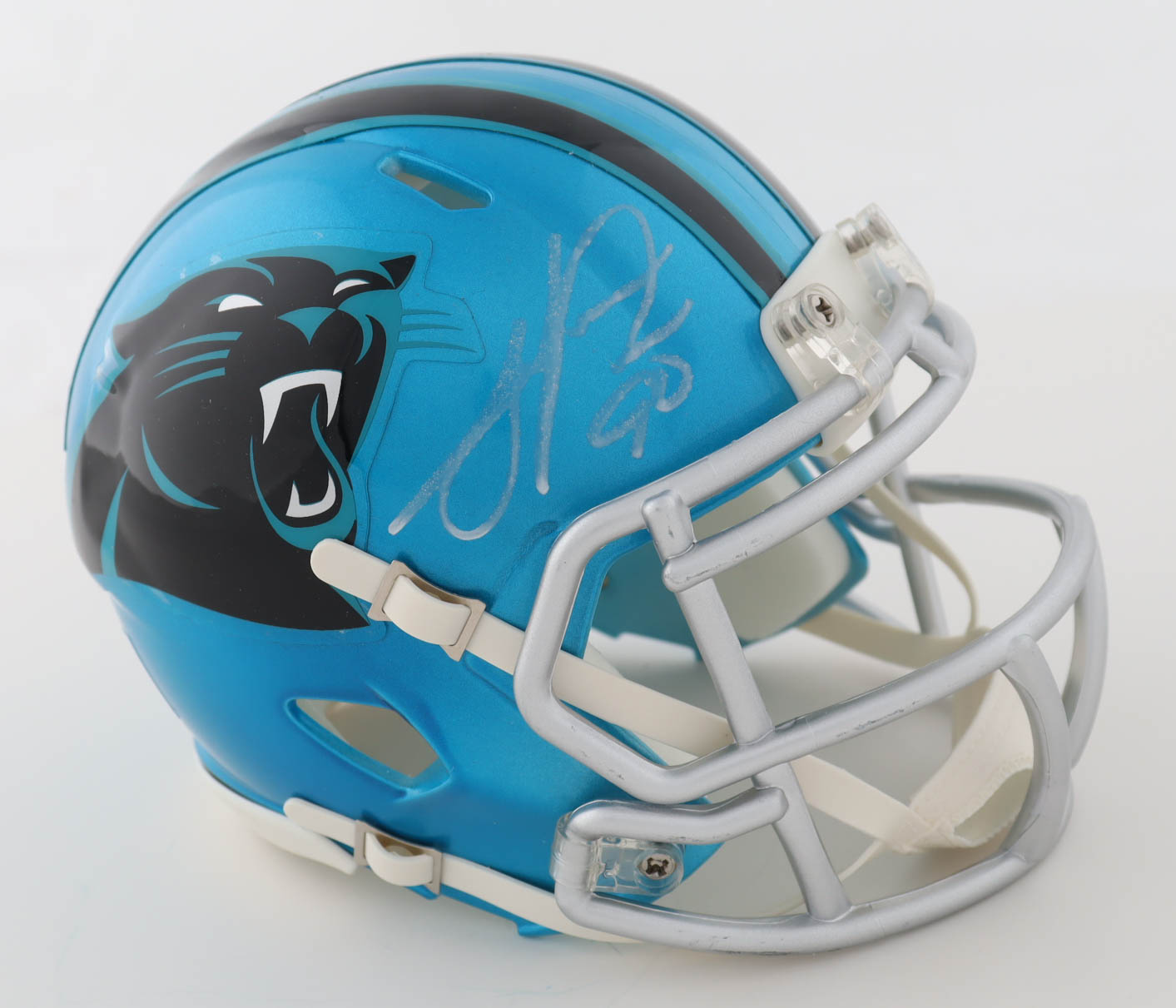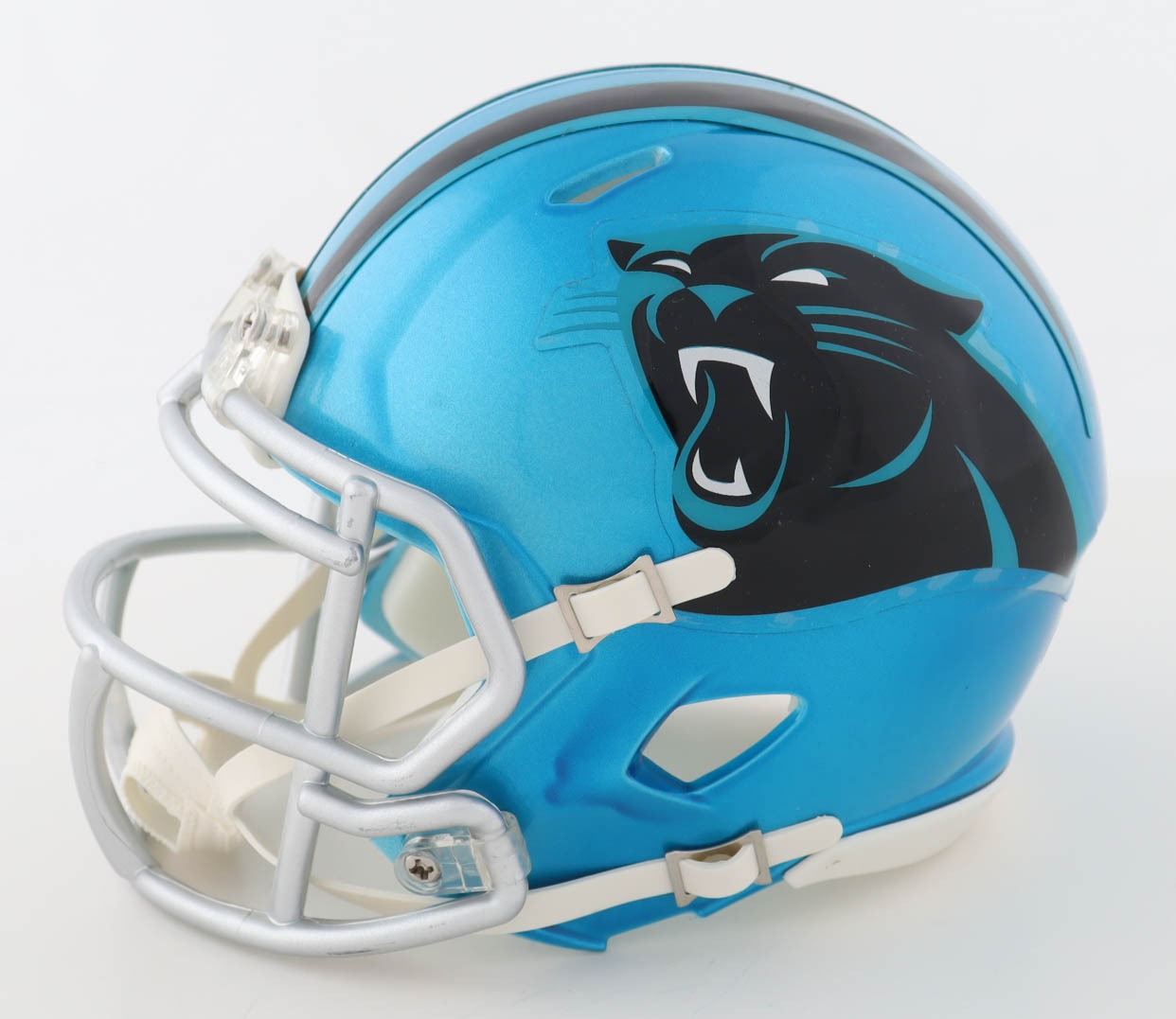 Riddell Carolina Panthers Flash alternate speed mini helmet. Hand-signed by Julius Peppers (HOF). Please note the signature is faint.