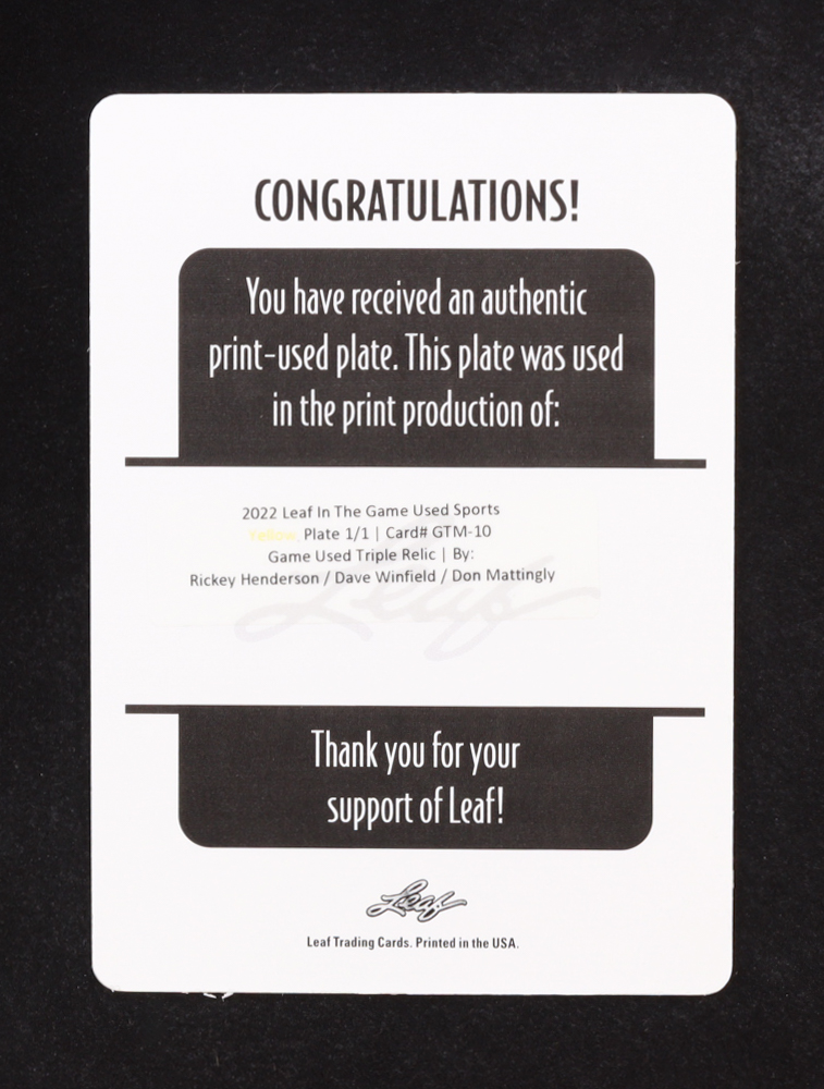 Rickey Henderson / Dave Winfield / Don Mattingly 2022 Leaf ITG Used Sports Game-Used Triple Relic Yellow Proof Plate #GTM10 #1/1