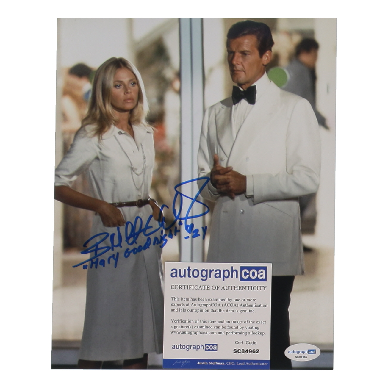 Photo measures 8" x 10" and has been hand-signed and inscribed by Britt Ekland (Mary Goodnight).