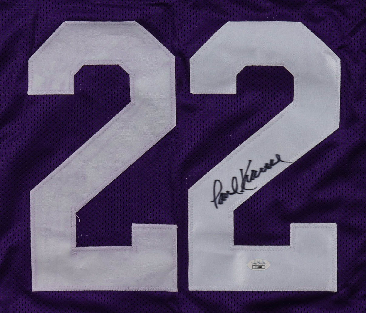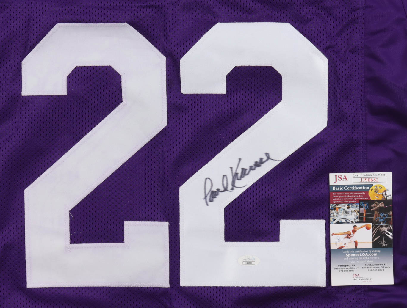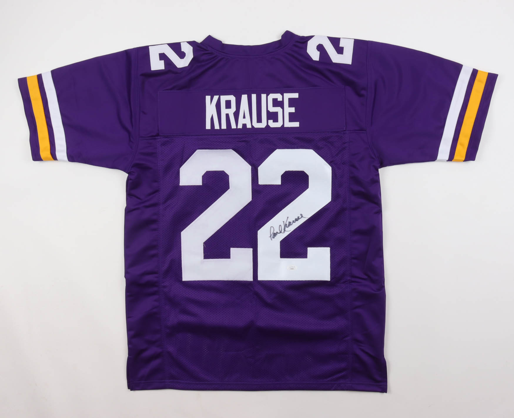 Custom jersey with everything sewn on, size XL. Hand-signed by Paul Krause (HOF). Please note, the glue is visible through the reverse numbers.