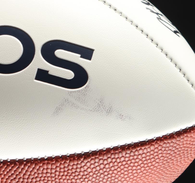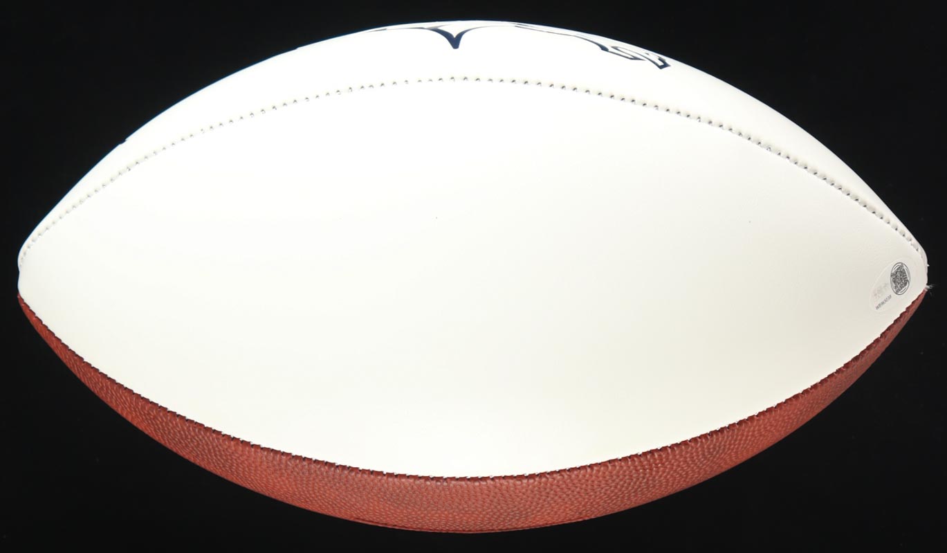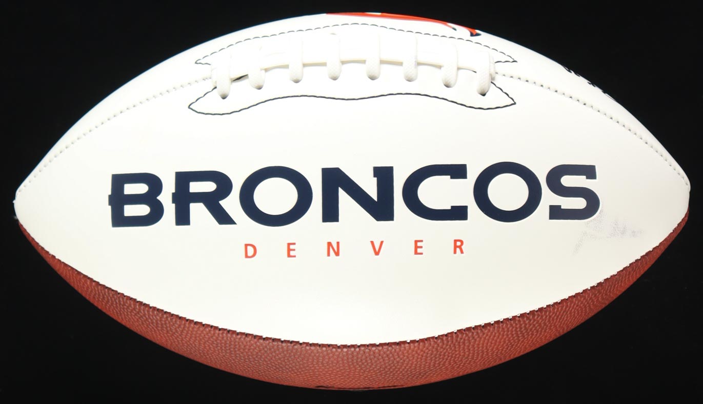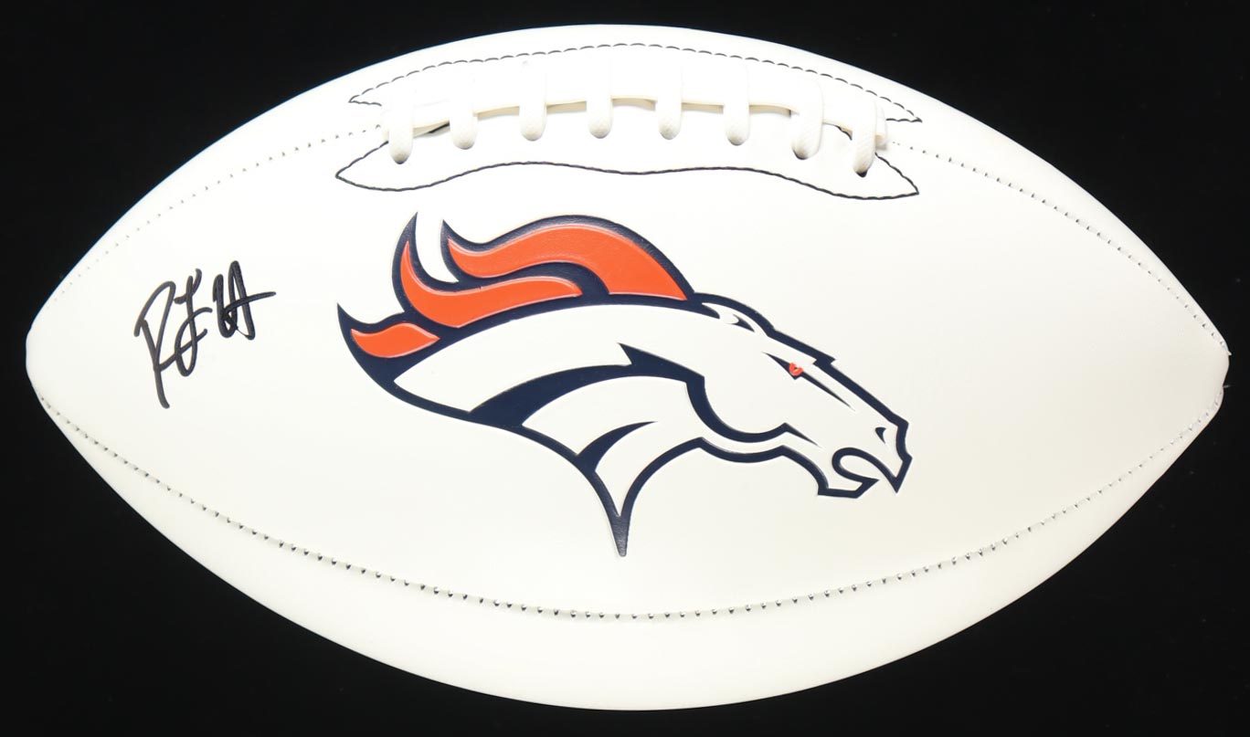 Denver Broncos logo football. Hand-signed by RJ Harvey. Please note, there is an ink stain on one of the white panels. See photos for more details.