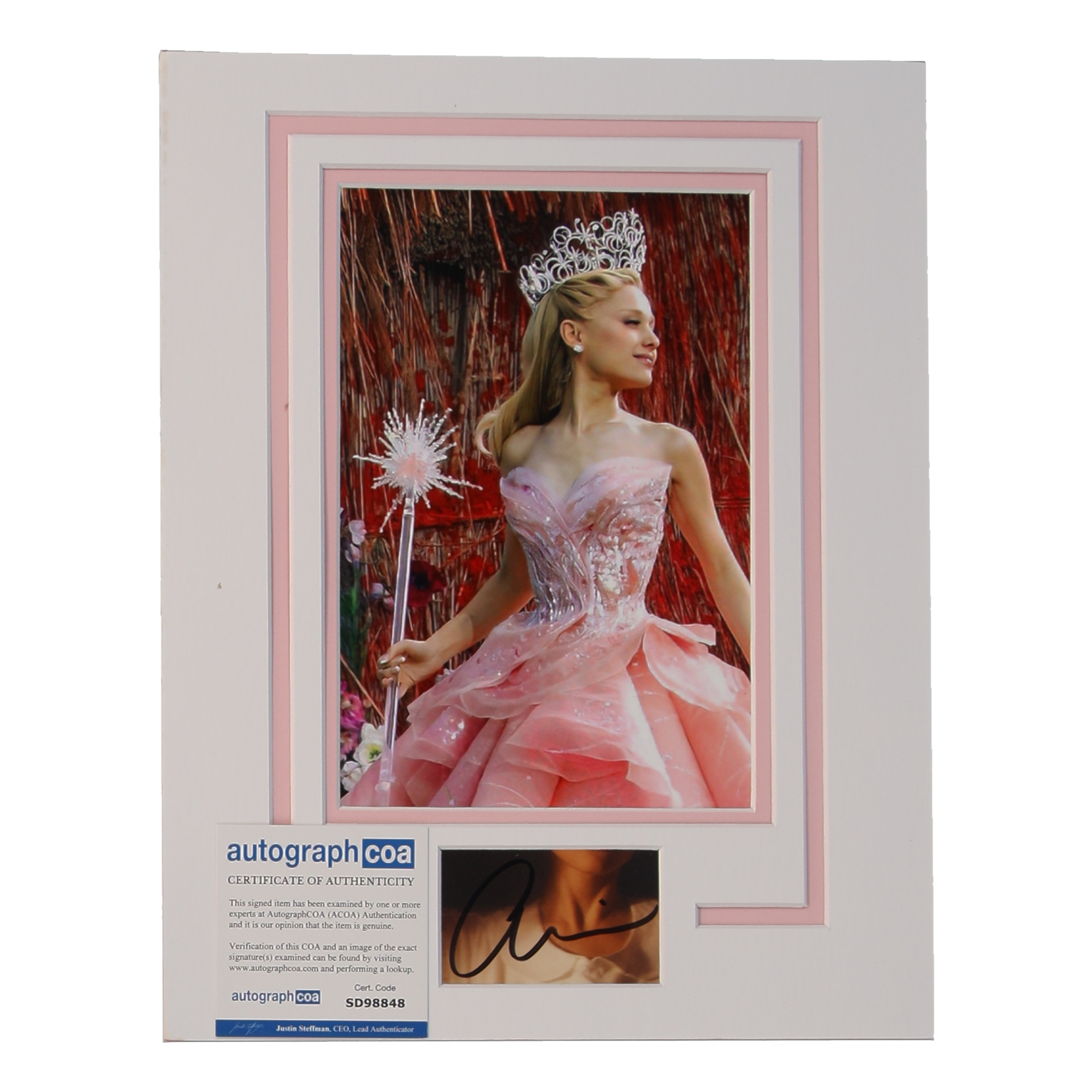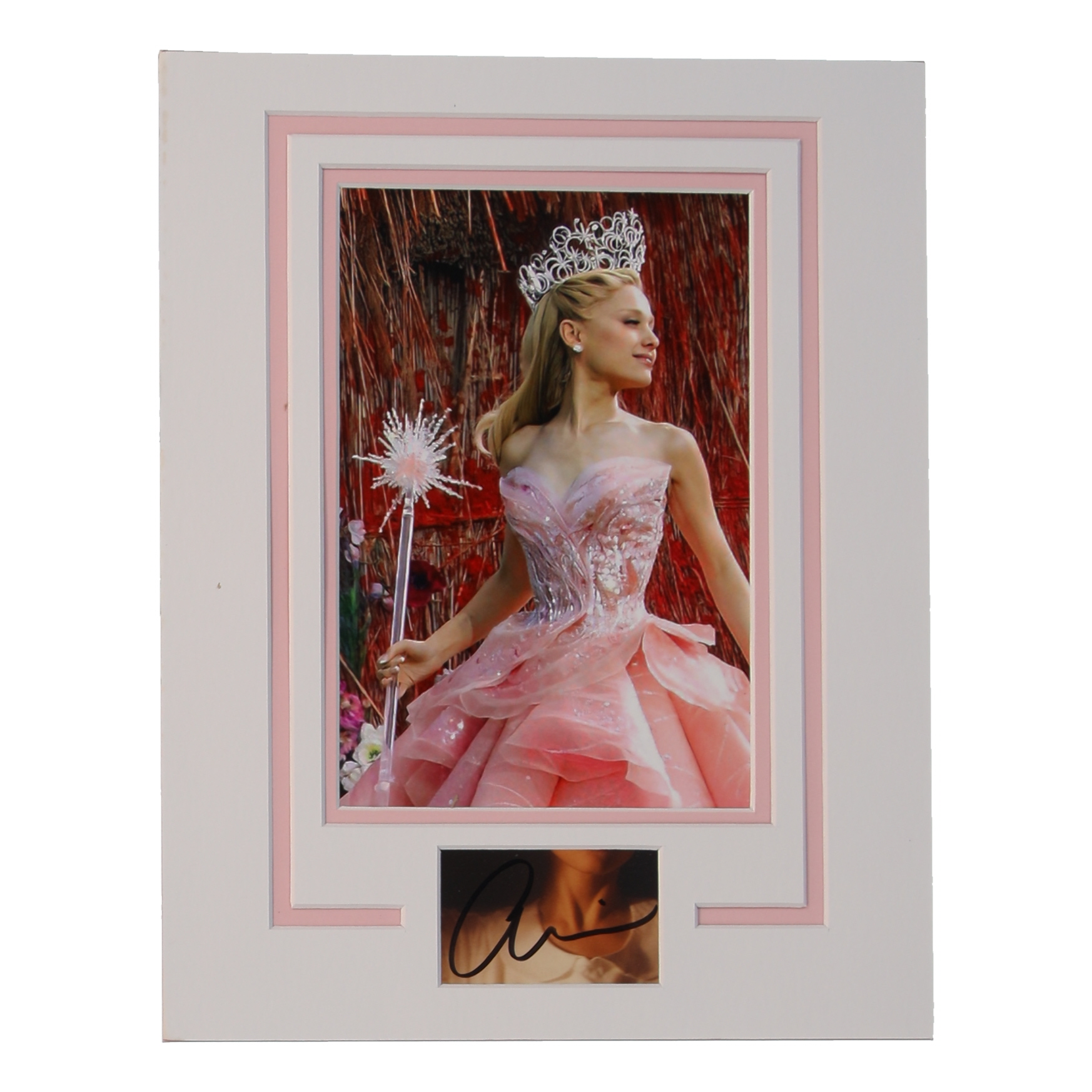 Custom photo display measures approximately 11" x 14" in size and features a cut that has been hand-signed by Ariana Grande (Glinda).