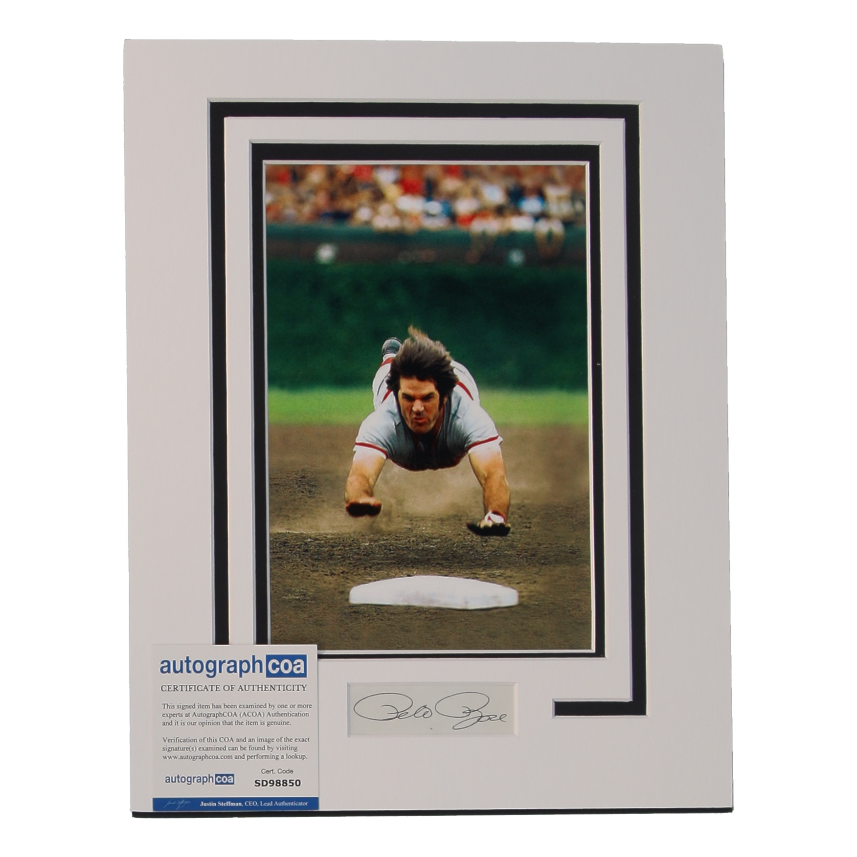 Custom photo display measures approximately 11" x 14" in size and features a cut that has been hand-signed by Pete Rose (D.2024, Cincinnati Reds)
