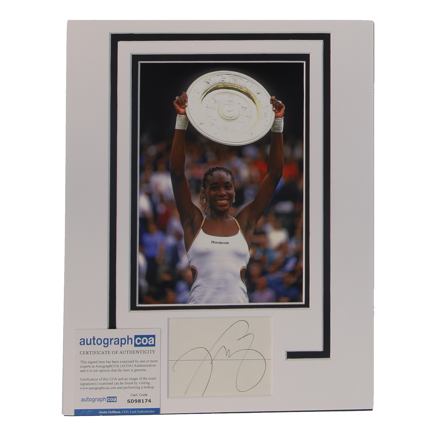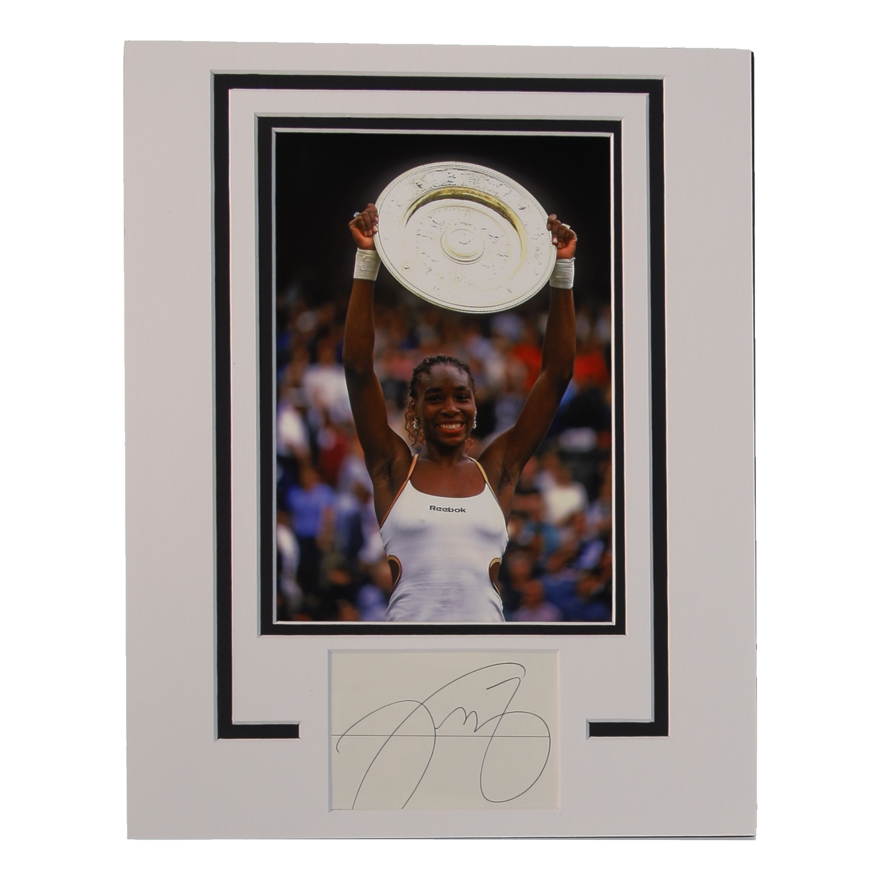 Custom lithograph measures 11" x 14" in size, featuring a cut that has been hand-signed by Venus Williams. Display also features an 8" x 10" photo.