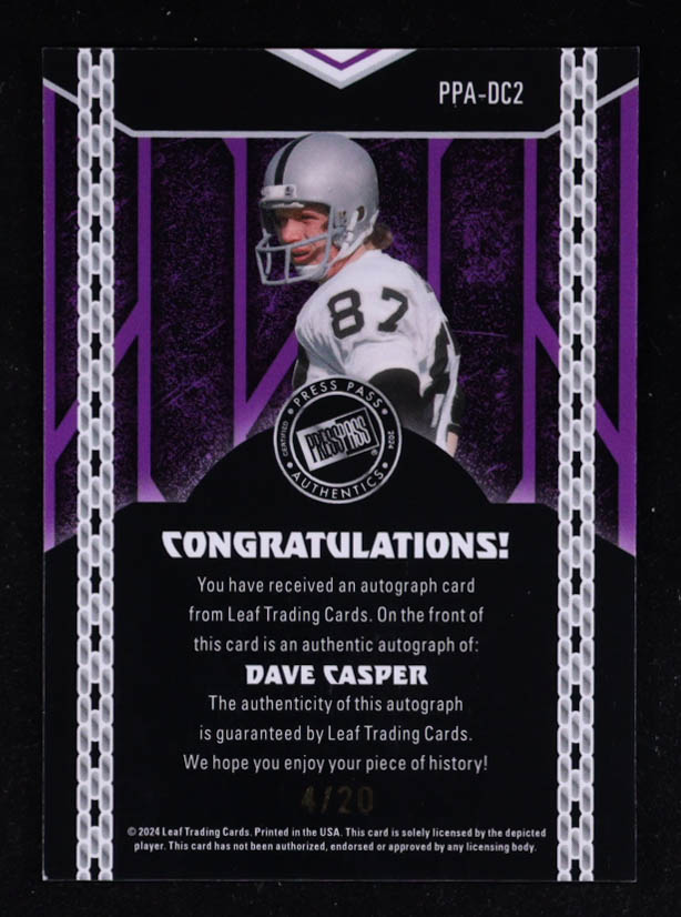 Dave Casper 2024 Leaf Press Pass Blue Shimmer Autograph #PPADC2 #4/20