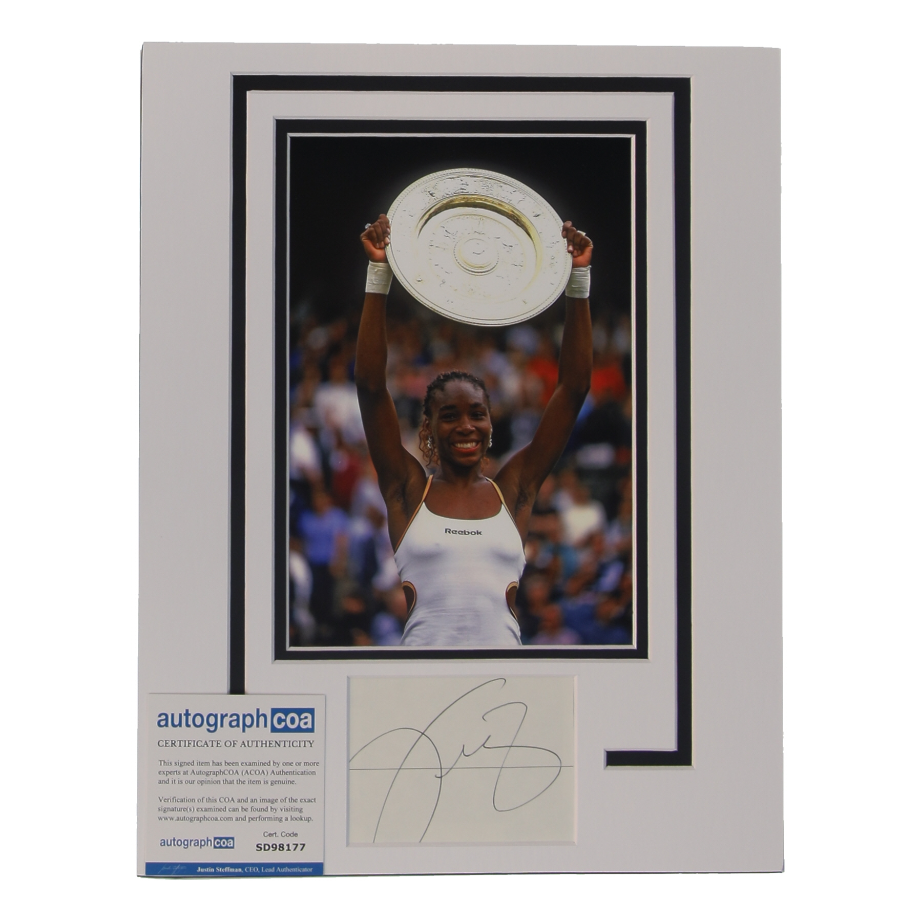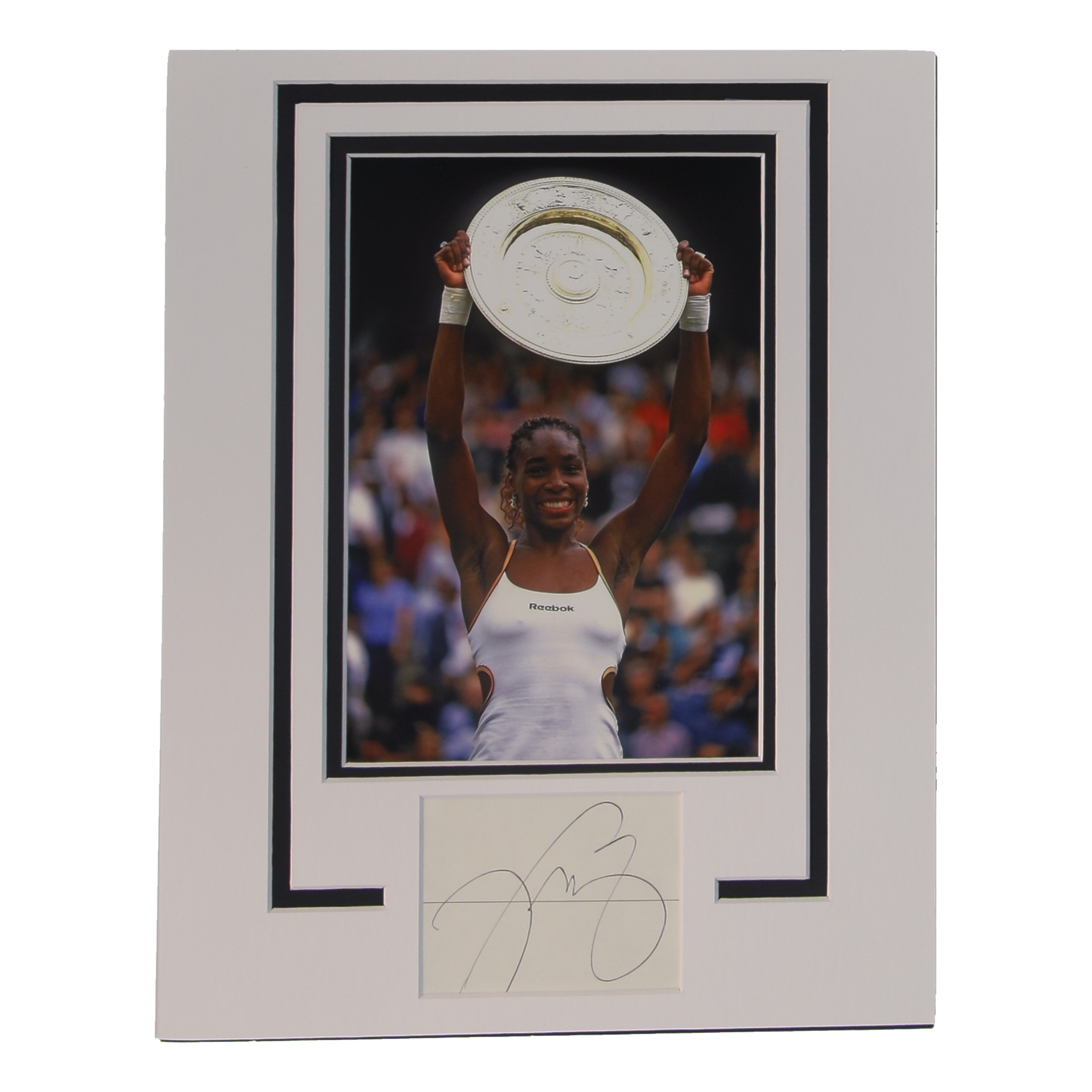 Custom lithograph measures 11" x 14" in size, featuring a cut that has been hand-signed by Venus Williams. Display also features an 8" x 10" photo.