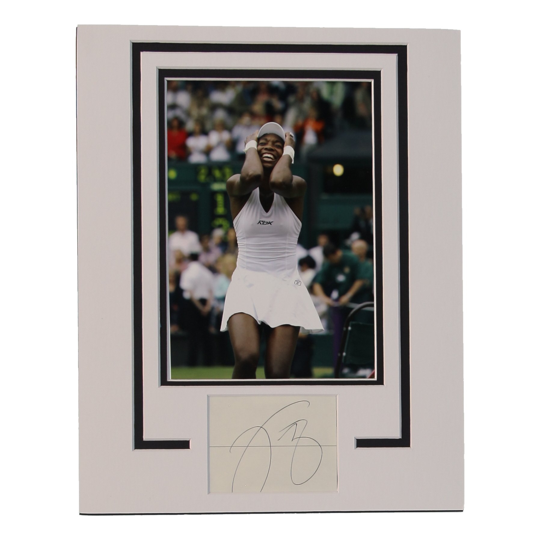 Custom lithograph measures 11" x 14" in size, featuring a cut that has been hand-signed by Venus Williams. Display also features an 8" x 10" photo.