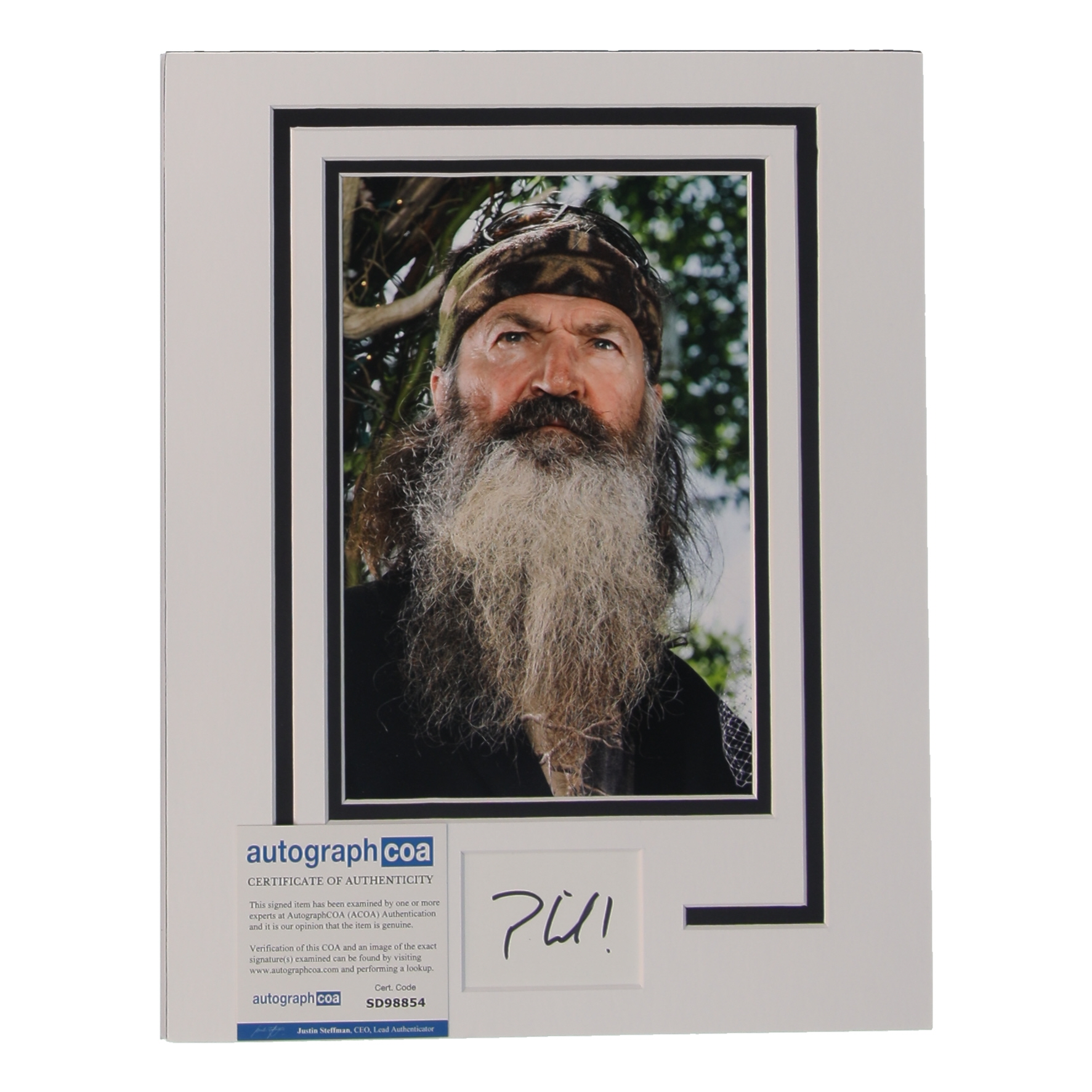 Custom photo display measures approximately 11" x 14" in size and features a cut that has been hand-signed by Phil Robertson.
