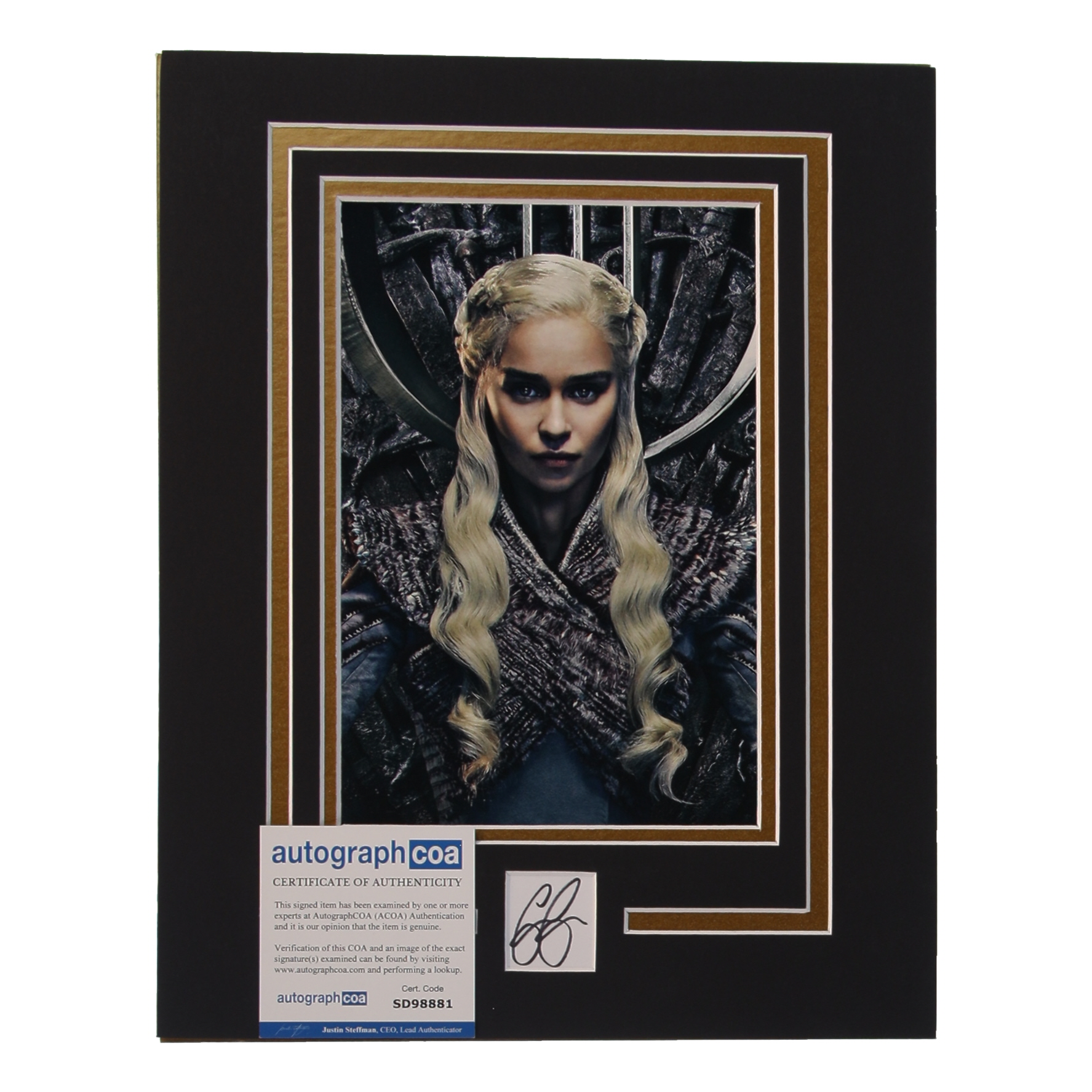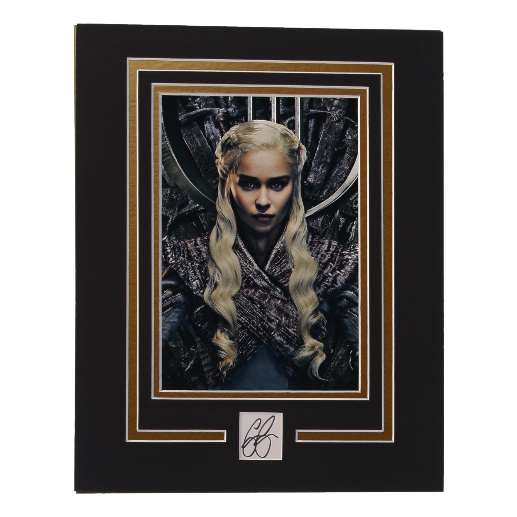 Custom photo display measures approximately 11" x 14" in size and features a cut that has been hand-signed by Emilia Clarke (Daenerys Targaryen).