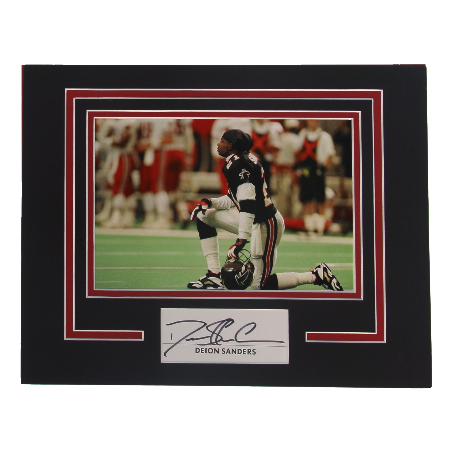 Custom photo display measures approximately 11" x 14" in size and features a cut that has been hand-signed by Deion Sanders (Atlanta Falcons, HOF).