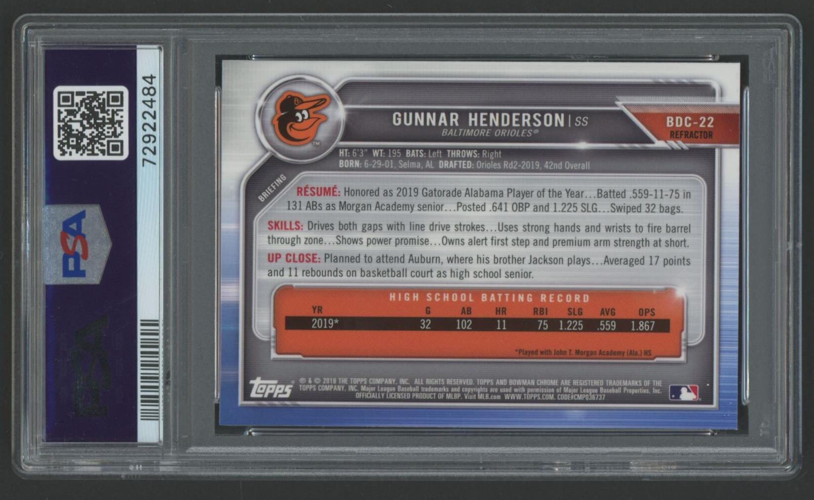 Gunnar Henderson 2019 Bowman Chrome Draft Refractor #BDC22 (PSA 10)