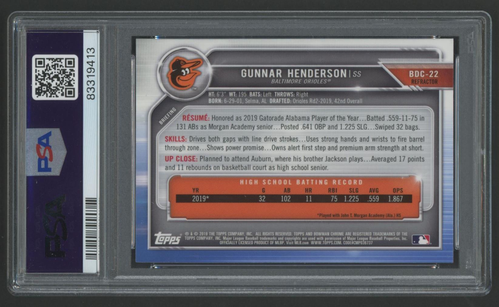 Gunnar Henderson 2019 Bowman Chrome Draft Refractor #BDC22 (PSA 10)