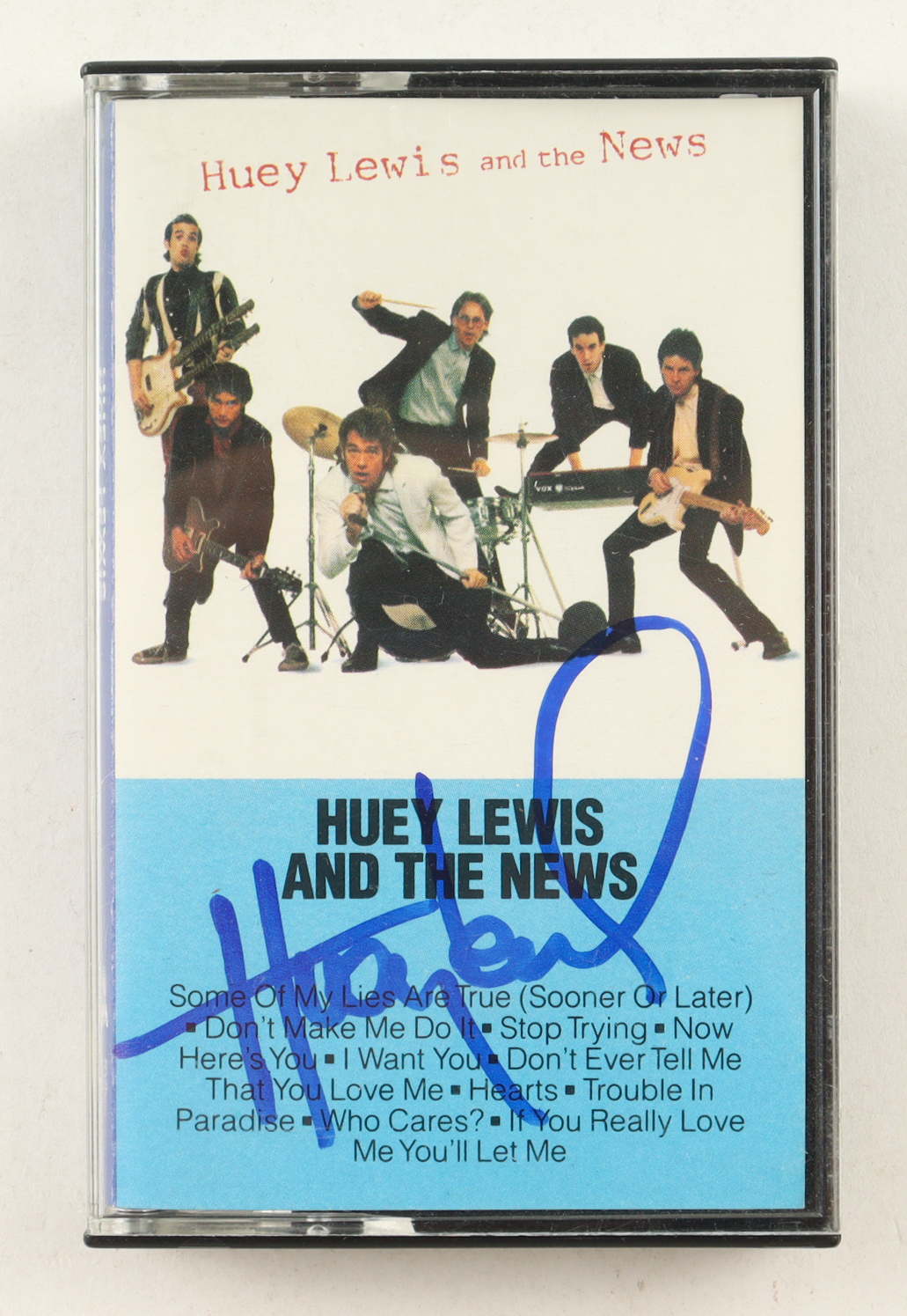 Cassette tape album cover insert has been hand-signed by Huey Lewis. Please note, cassette is included as shown.