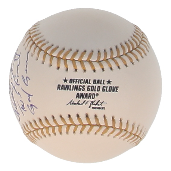Rawlings Official Gold Glove Award Baseball. Hand-signed and inscribed by Andres Galarraga (Montreal Expos). Please note, there are minor stains throughout the baseball.