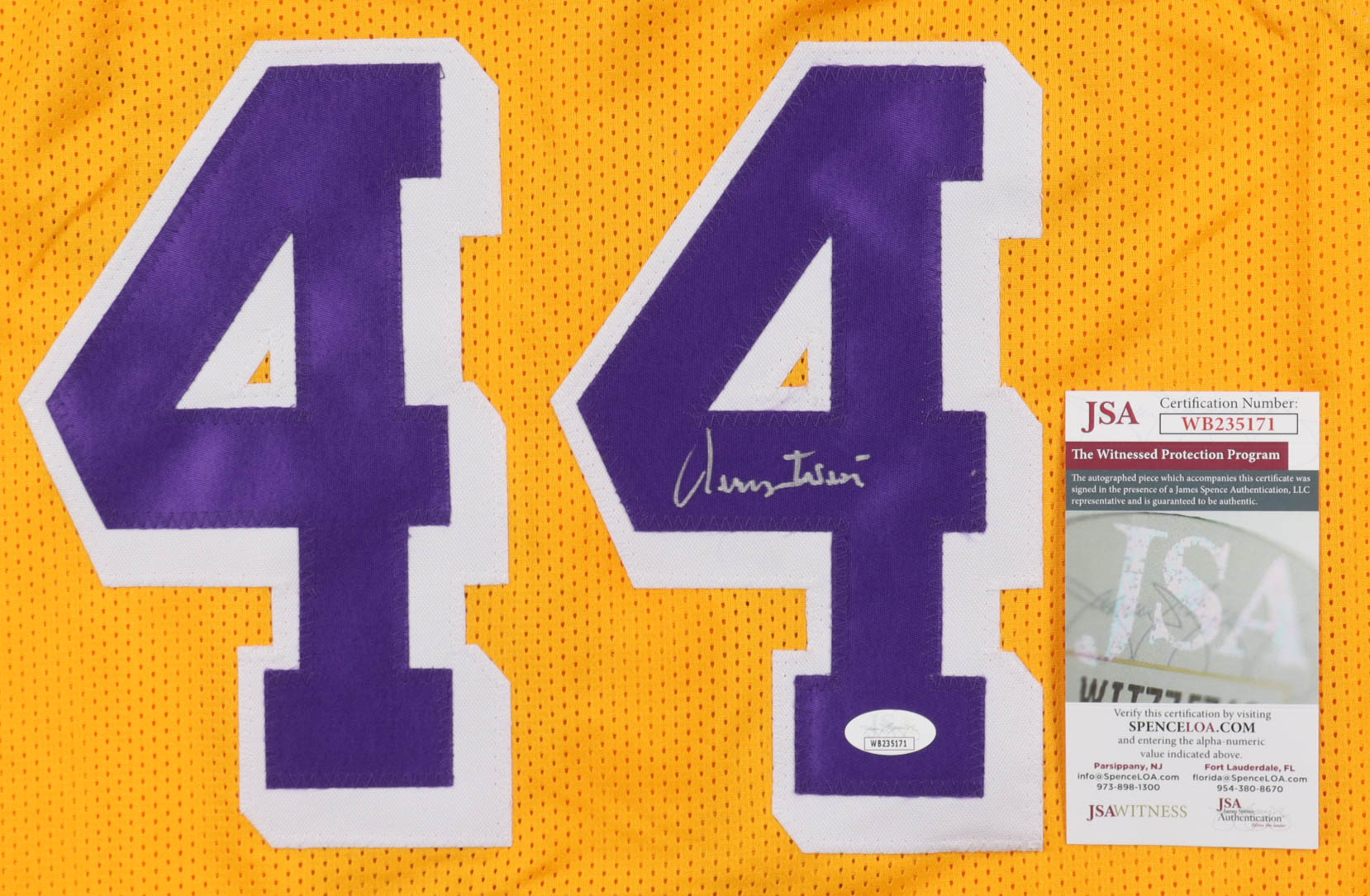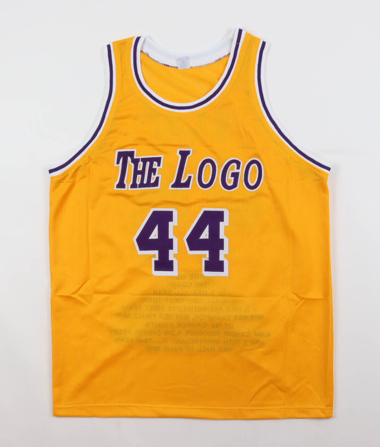 Custom jersey with everything sewn on, size XL. Hand-signed by Jerry West (D. 2024, Los Angeles Lakers, HOF). West's career highlights are custom stitched below the numbers on the reverse side of the jersey.