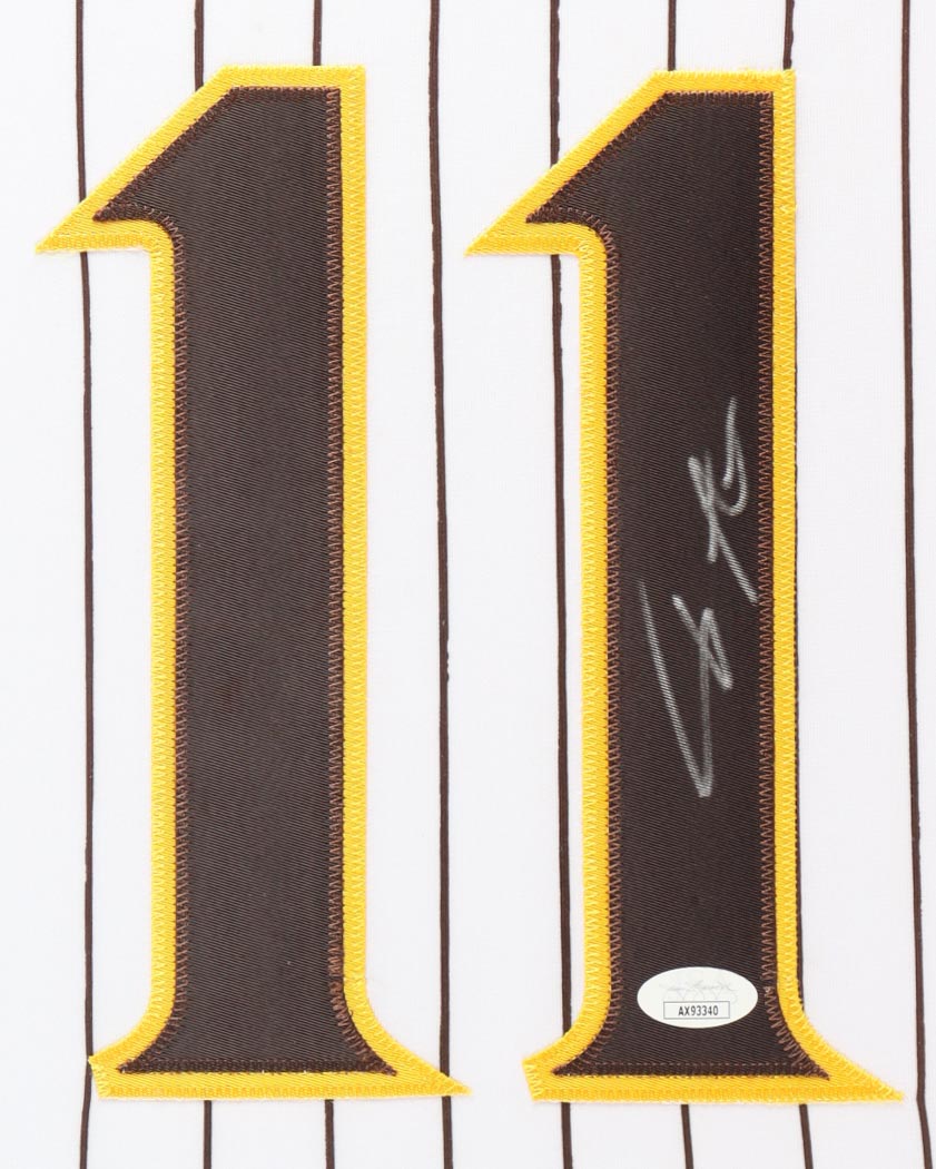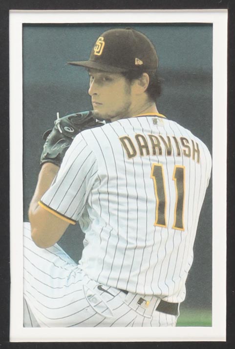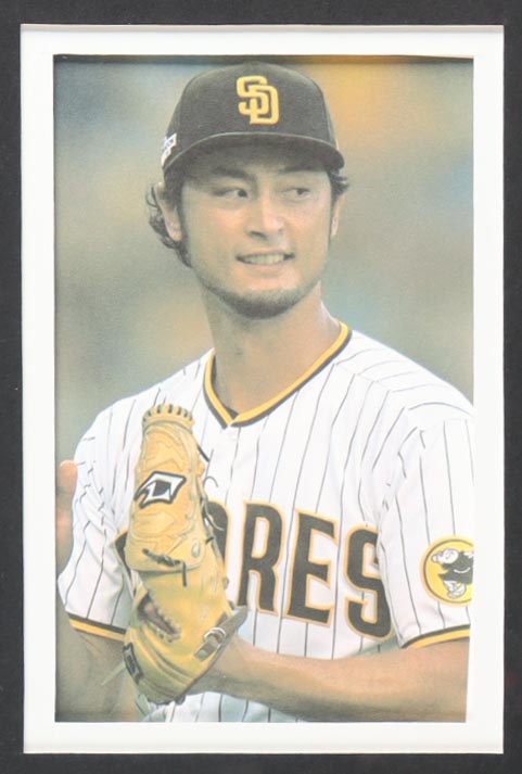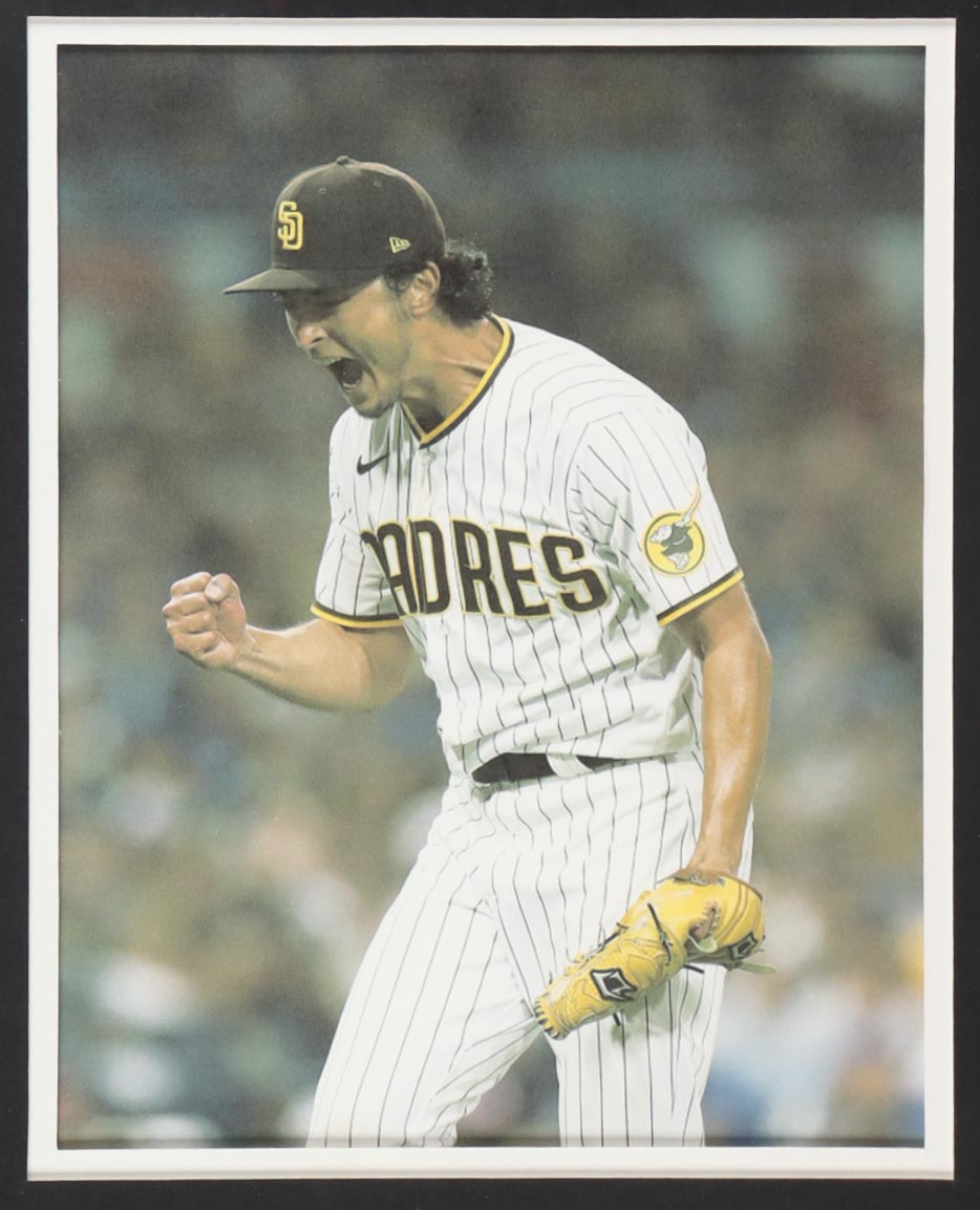 Custom frame measures 34" x 42" in size. Jersey has been hand-signed by Yu Darvish (San Diego Padres). Display also includes (4) unsigned photographs and a team logo patch.