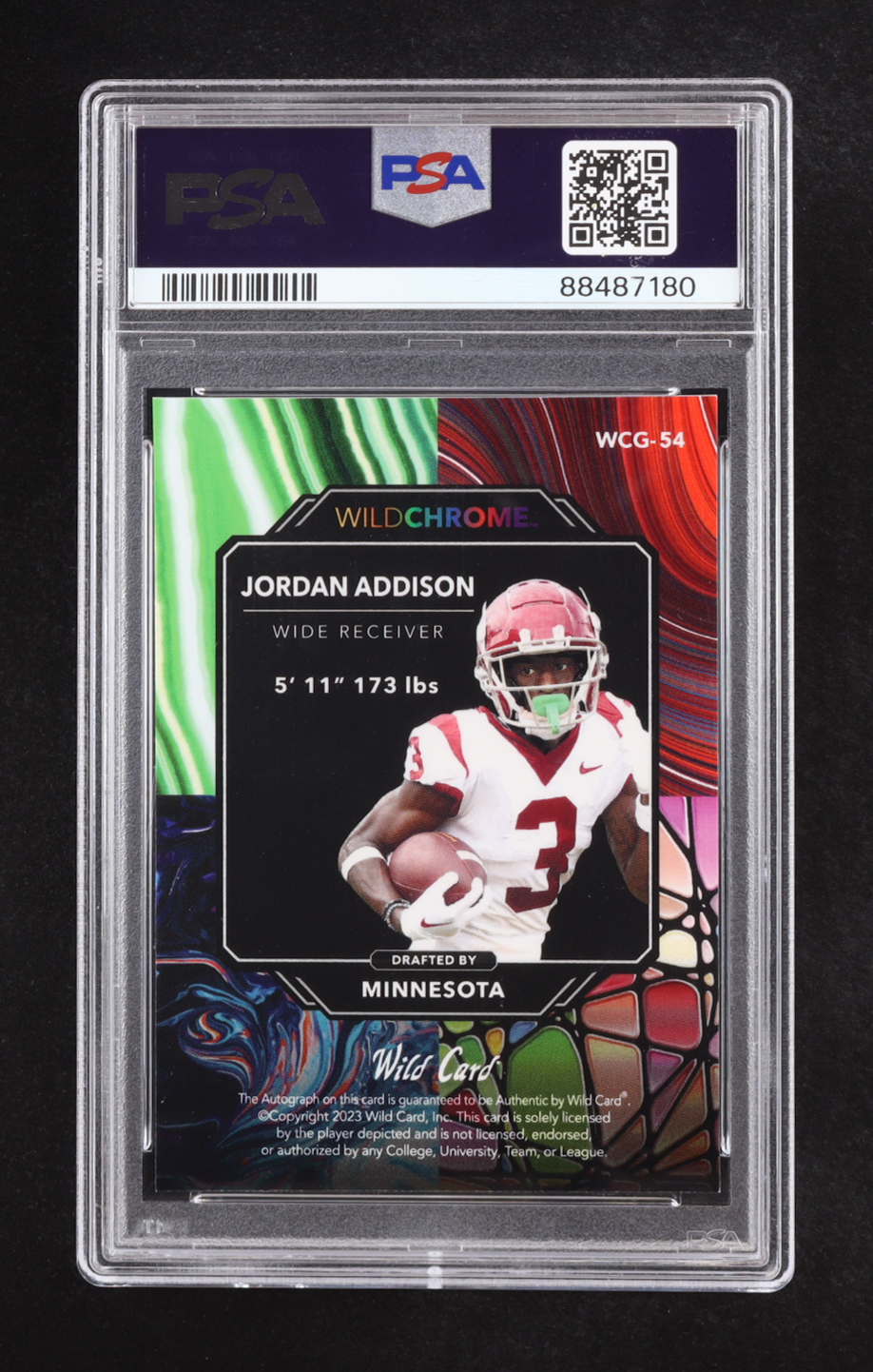 Jordan Addison 2023 Wild Card Wild Chrome Autograph Glass Teal Crystal #WCG54 #4/8 RC (PSA 9)