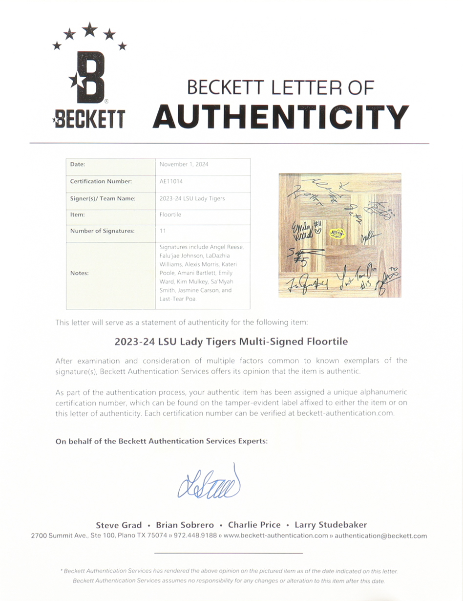 2023-24 LSU Lady Tigers National Champions Wood Floorboard Piece Signed by (11) with Angel Reese, Falu'jae Johnson, LaDazhia Williams, Alexis Morris (Beckett)