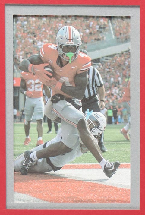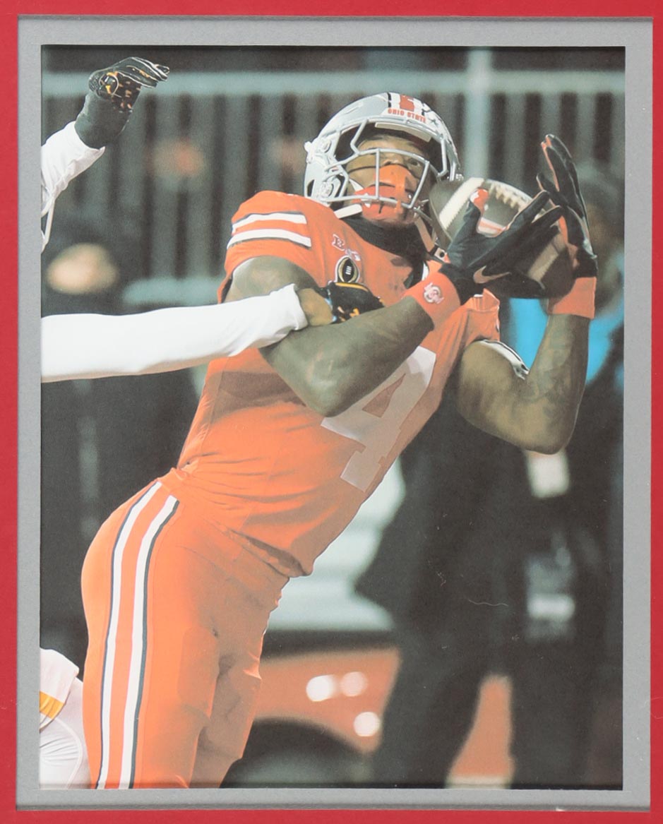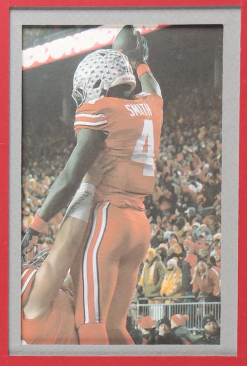Custom frame measures 34" x 42" in size. Jersey has been hand-signed by Jeremiah Smith. Display also includes (4) unsigned photographs and a team logo patch.