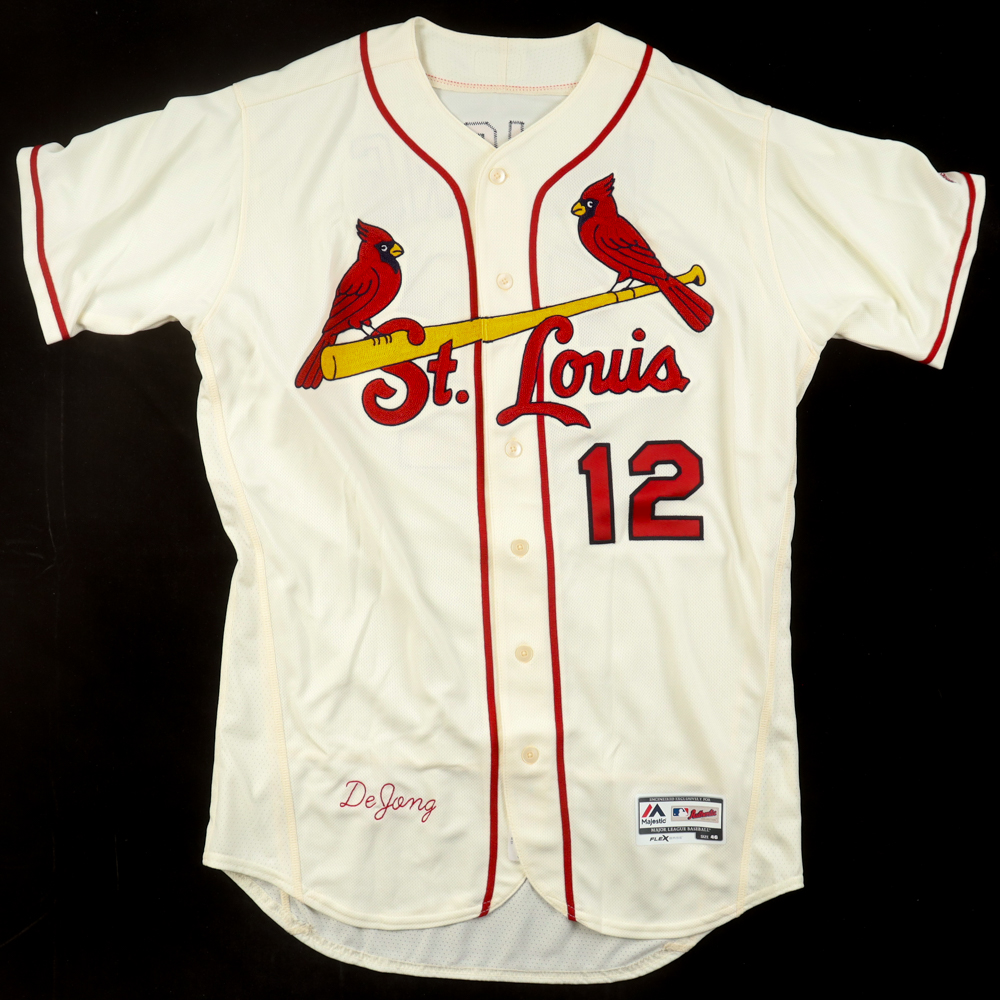 Majestic authentic jersey with everything sewn on, size 46. Hand-signed by Paul DeJong.