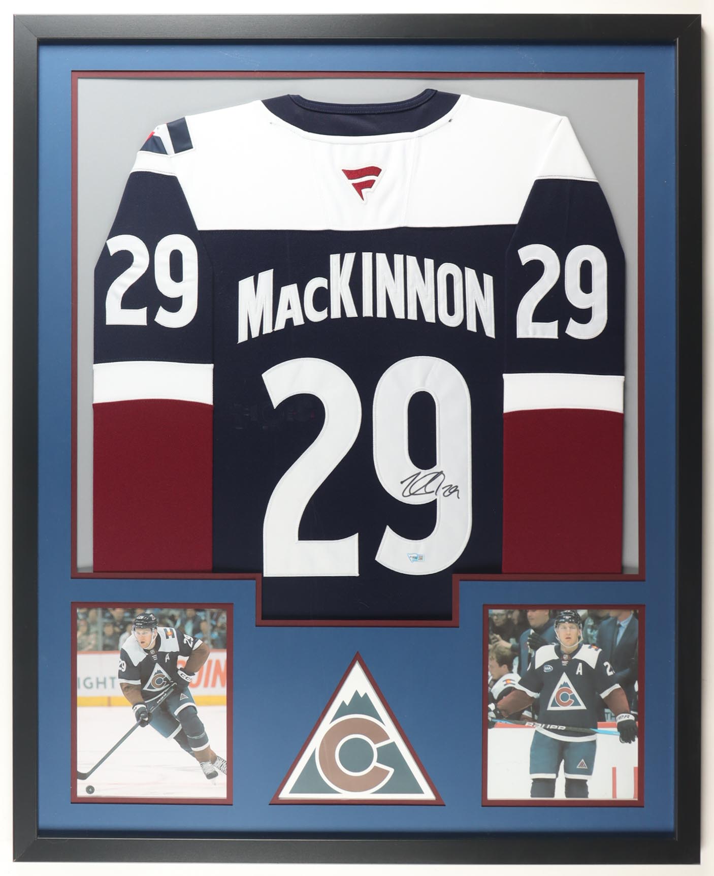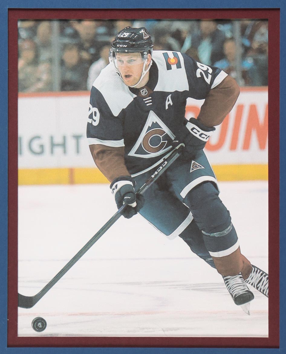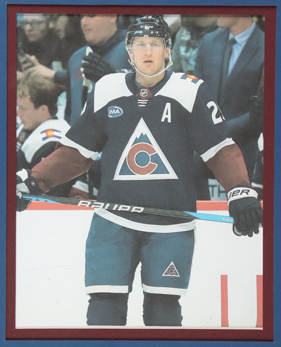 Custom frame measures 34" x 42" in size. Jersey has been hand-signed by Nathan MacKinnon (Colorado Avalanche). Display also includes (2) unsigned photographs and a team logo patch.