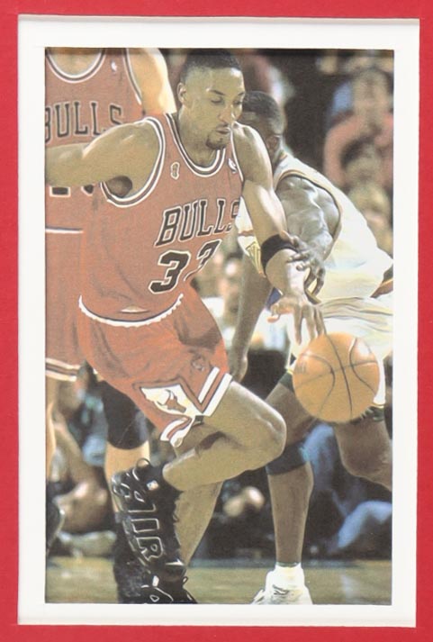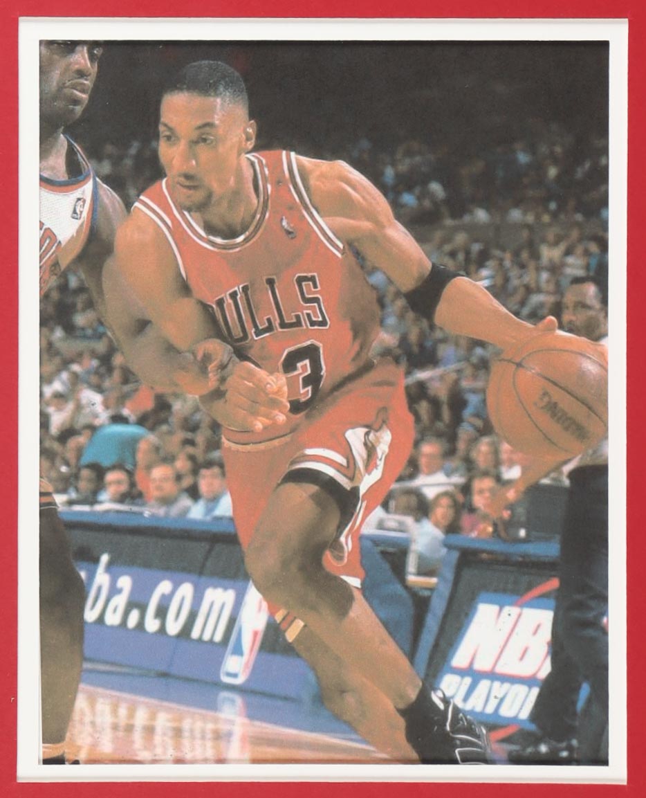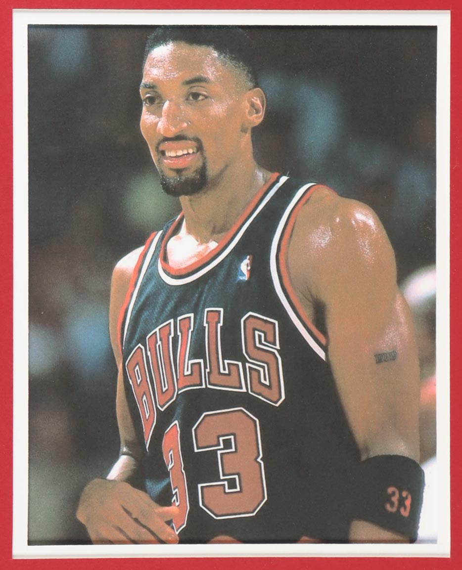 Custom frame measures 34" x 42" in size. Jersey has been hand-signed by Scotty Pippen (Chicago Bulls). Display also includes (4) unsigned photographs and a team logo patch.