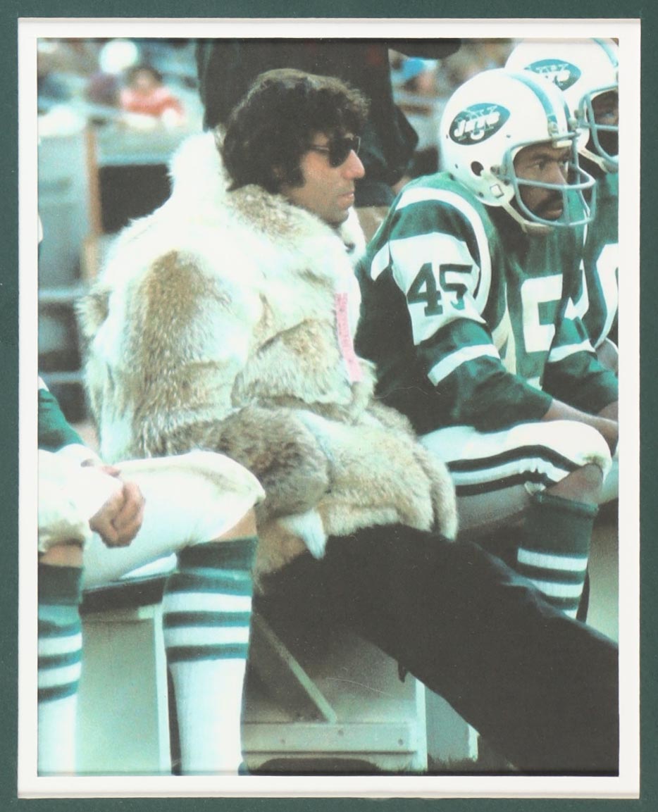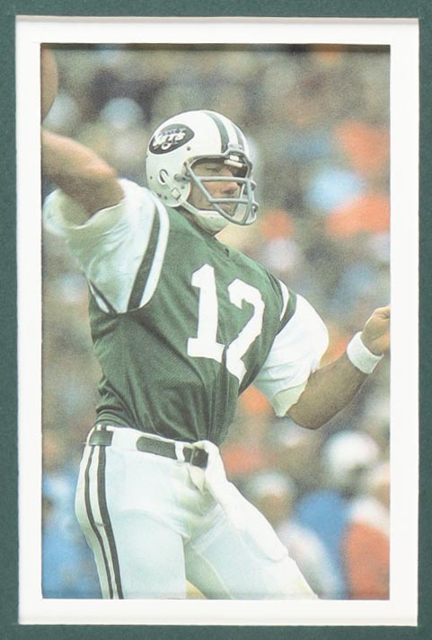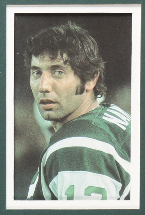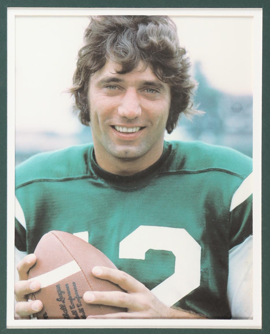 Custom frame measures 34" x 42" in size. Jersey has been hand-signed by Joe Namath (New York Jets, HOF). Display also includes (4) unsigned photographs and a team logo patch.