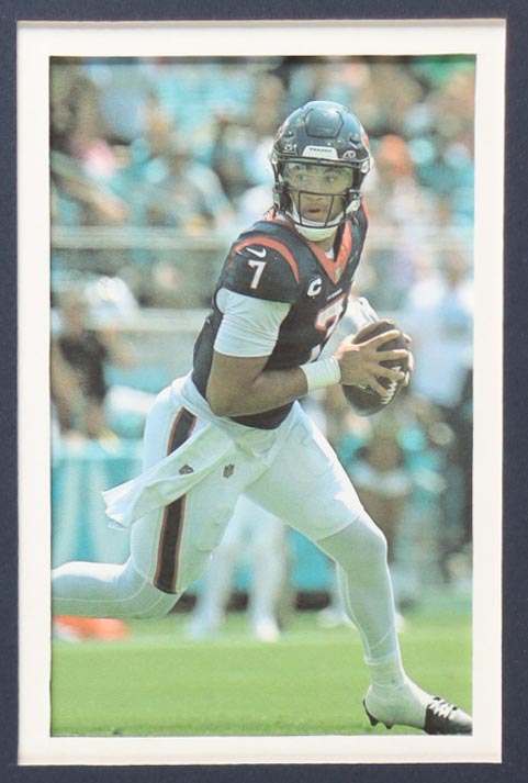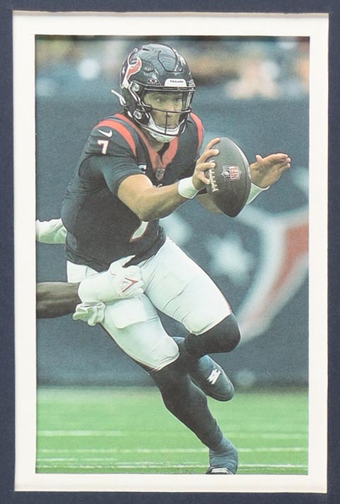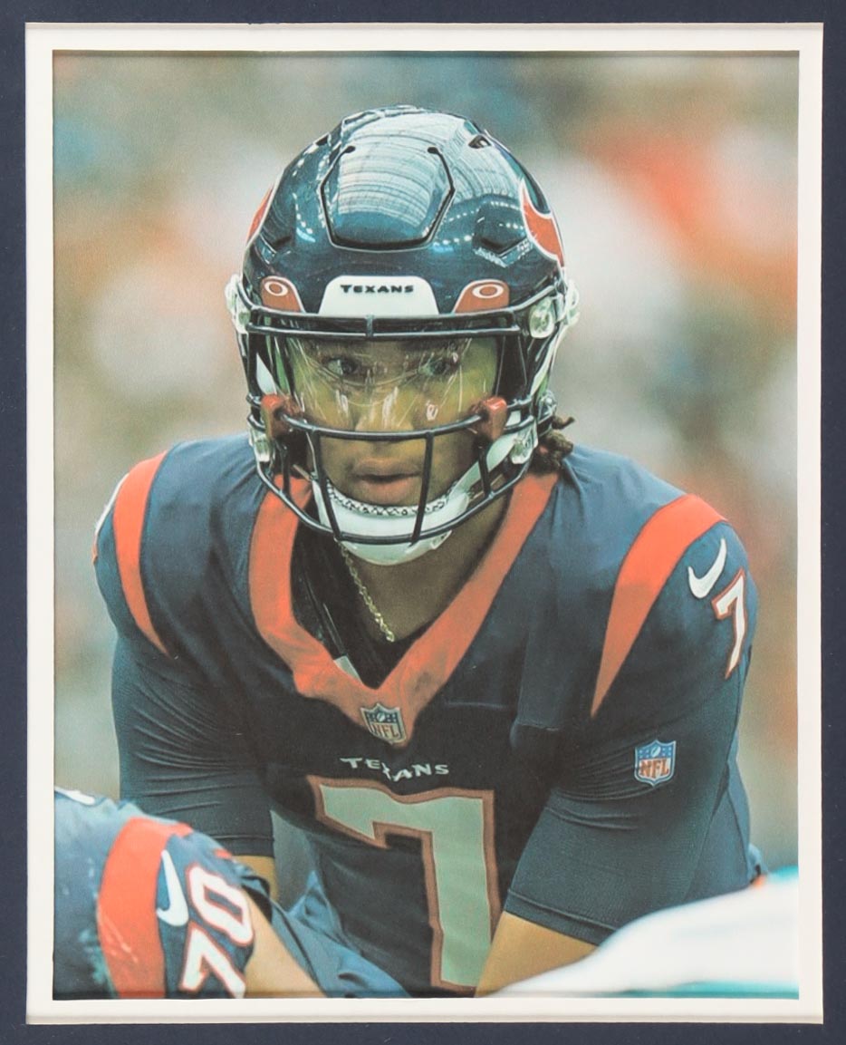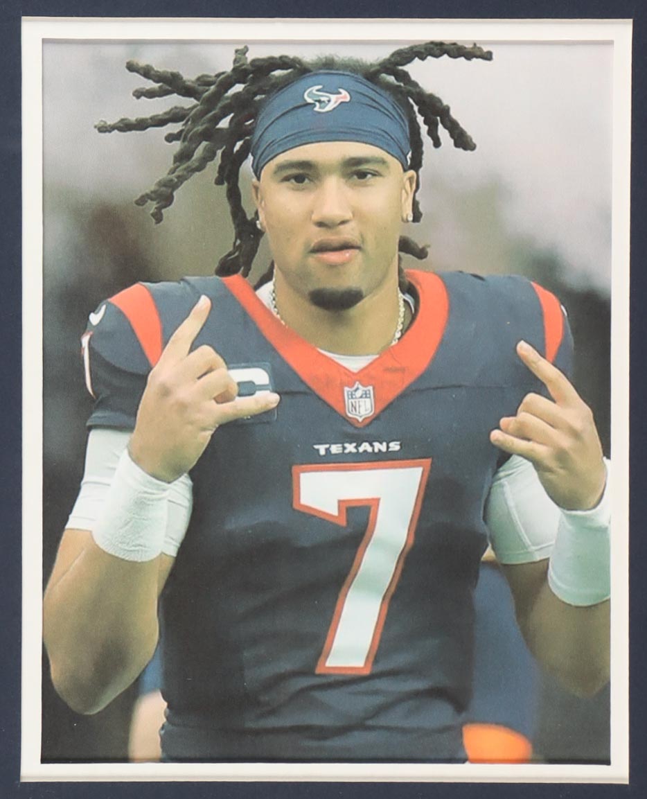 Custom frame measures 34" x 42" in size. Jersey has been hand-signed by CJ Stroud (Houston Texans). Display also includes (4) unsigned photographs and a team logo patch.