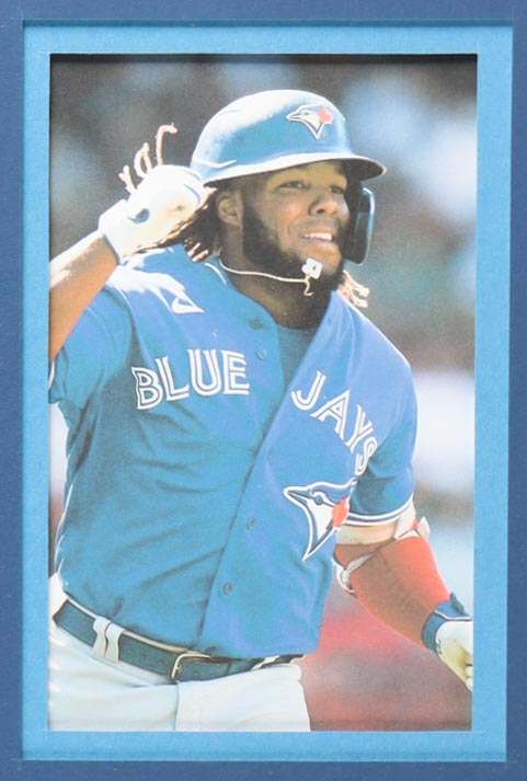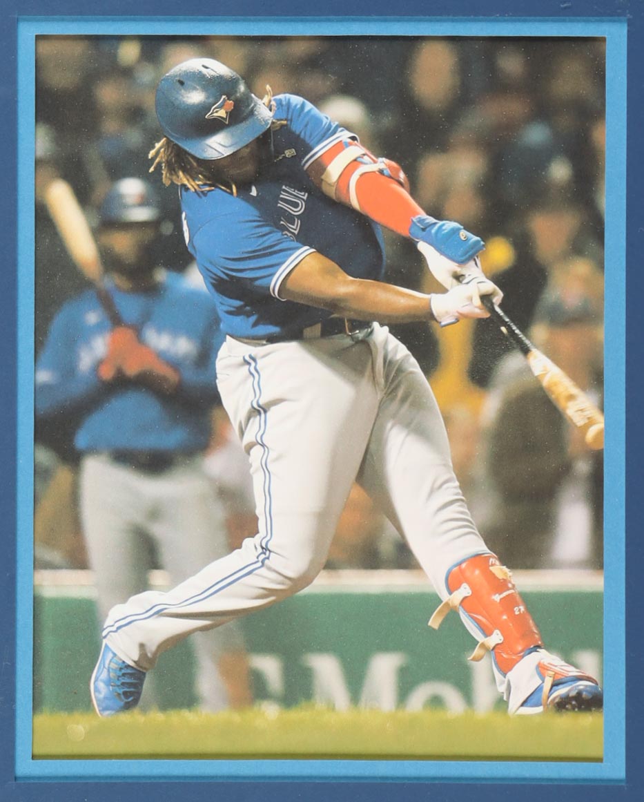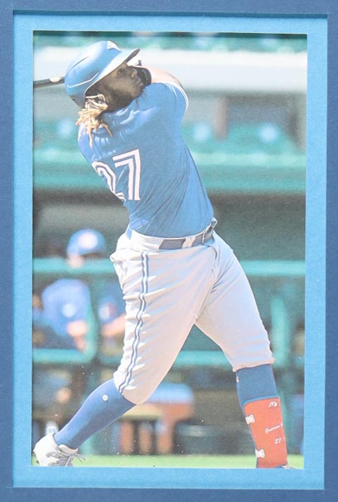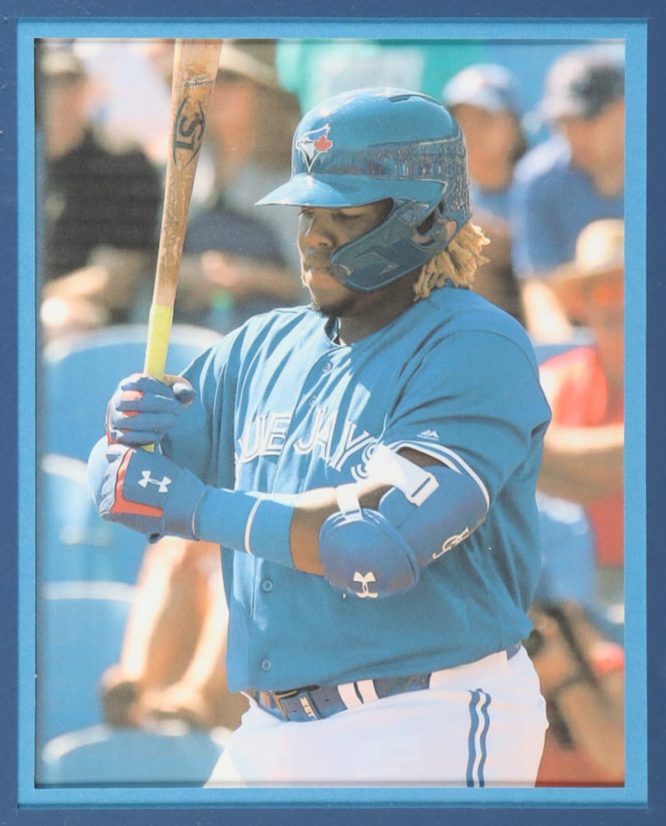 Custom frame measures 34" x 42" in size. Jersey has been hand-signed by Vladimir Guerrero Jr. (Toronto Blue Jays). Display also includes (4) unsigned photographs and a team logo patch.