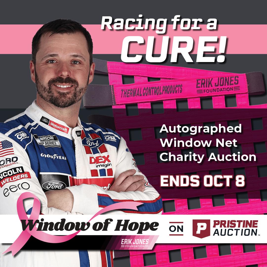 100% of the winning bid benefits the Erik Jones Foundation's Window of Hope program, which funds breast cancer detection and care across the country. The program has expanded each year with full NASCAR Cup Series participation and growing involvement from Xfinity and Truck teams.