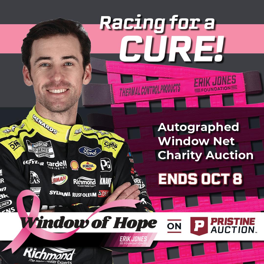 100% of the winning bid benefits the Erik Jones Foundation's Window of Hope program, which funds breast cancer detection and care across the country. The program has expanded each year with full NASCAR Cup Series participation and growing involvement from Xfinity and Truck teams.