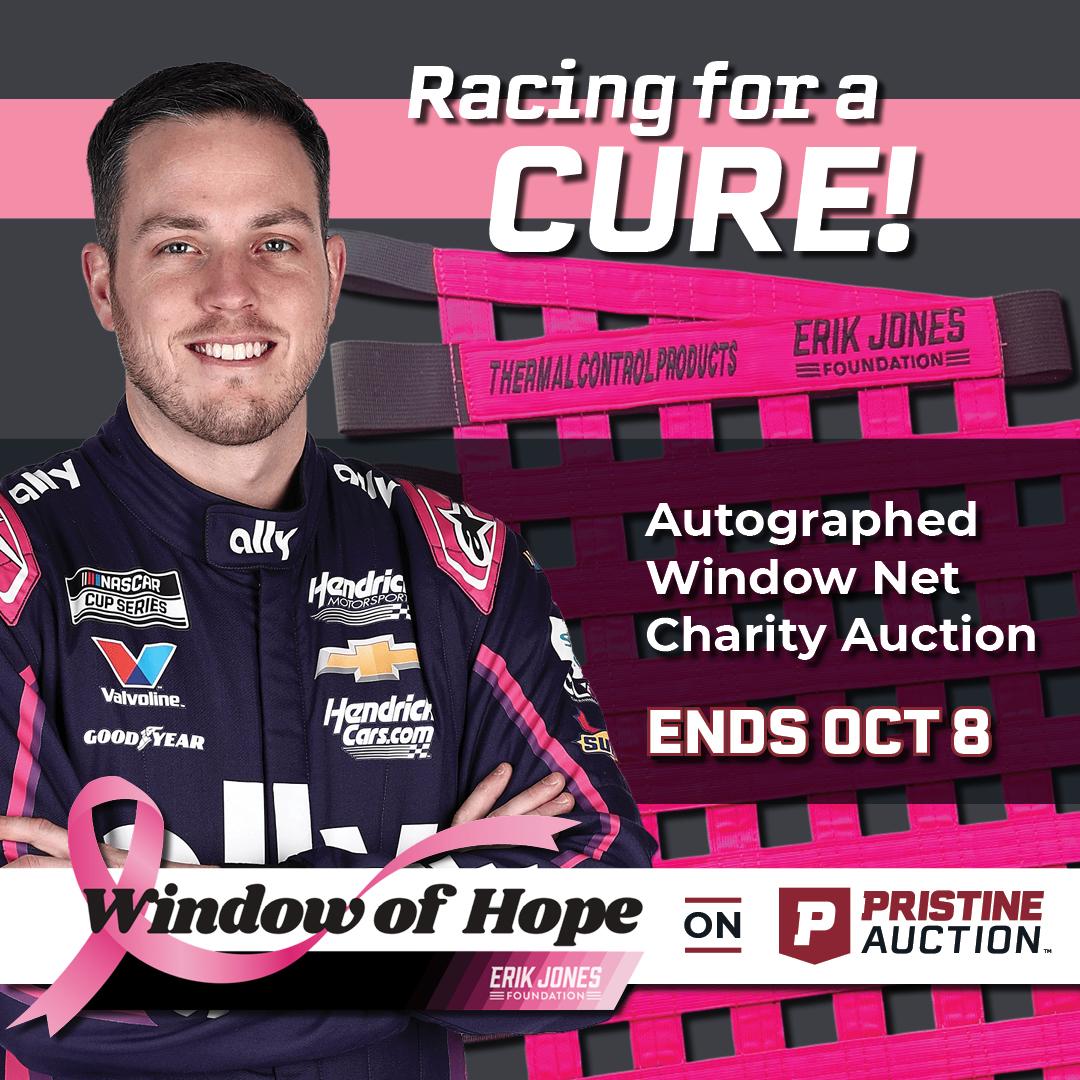 100% of the winning bid benefits the Erik Jones Foundation's Window of Hope program, which funds breast cancer detection and care across the country. The program has expanded each year with full NASCAR Cup Series participation and growing involvement from Xfinity and Truck teams.