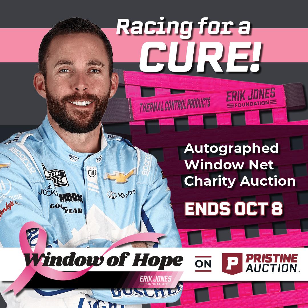 100% of the winning bid benefits the Erik Jones Foundation's Window of Hope program, which funds breast cancer detection and care across the country. The program has expanded each year with full NASCAR Cup Series participation and growing involvement from Xfinity and Truck teams.