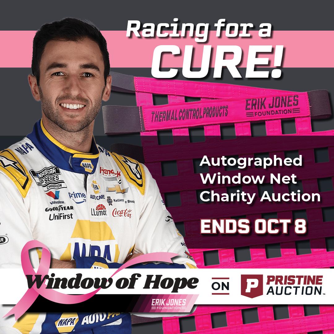 100% of the winning bid benefits the Erik Jones Foundation's Window of Hope program, which funds breast cancer detection and care across the country. The program has expanded each year with full NASCAR Cup Series participation and growing involvement from Xfinity and Truck teams.