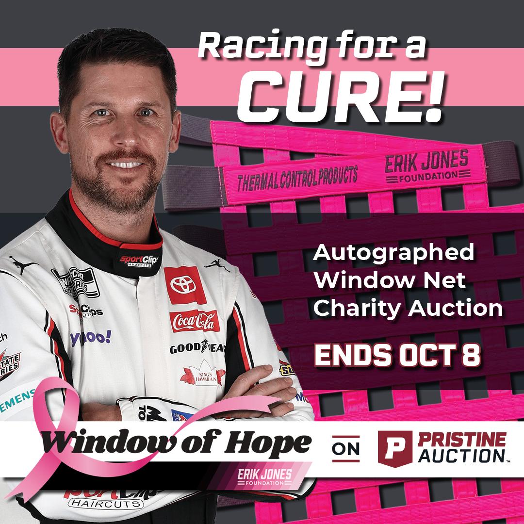 100% of the winning bid benefits the Erik Jones Foundation's Window of Hope program, which funds breast cancer detection and care across the country. The program has expanded each year with full NASCAR Cup Series participation and growing involvement from Xfinity and Truck teams.