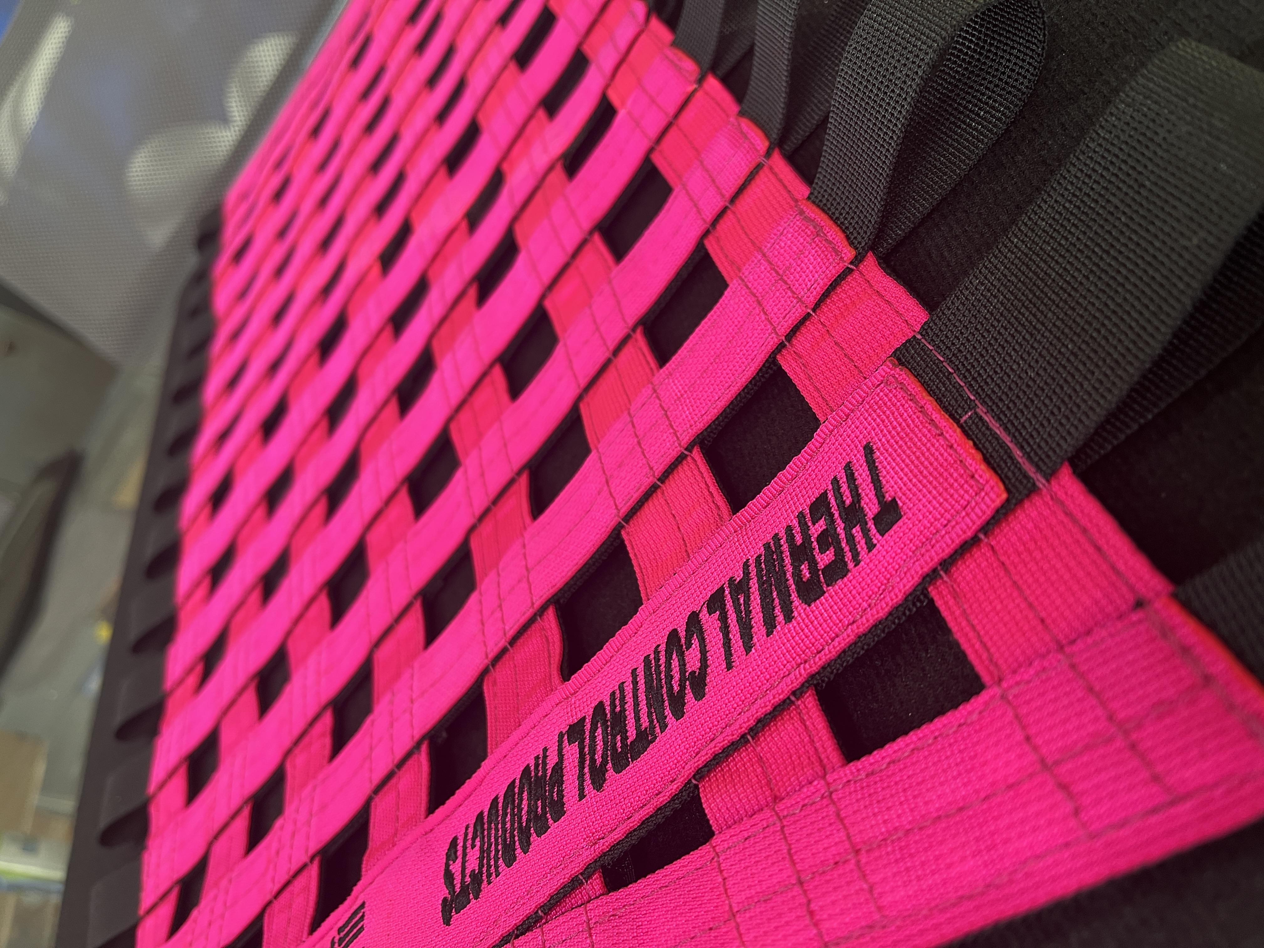 This pink window net will be installed on the #11 car during the 2025 Bank of America ROVAL 400 at Charlotte Motor Speedway on October 5, 2025. The net will carry authentic marks of competition and will be personally autographed by Denny Hamlin.