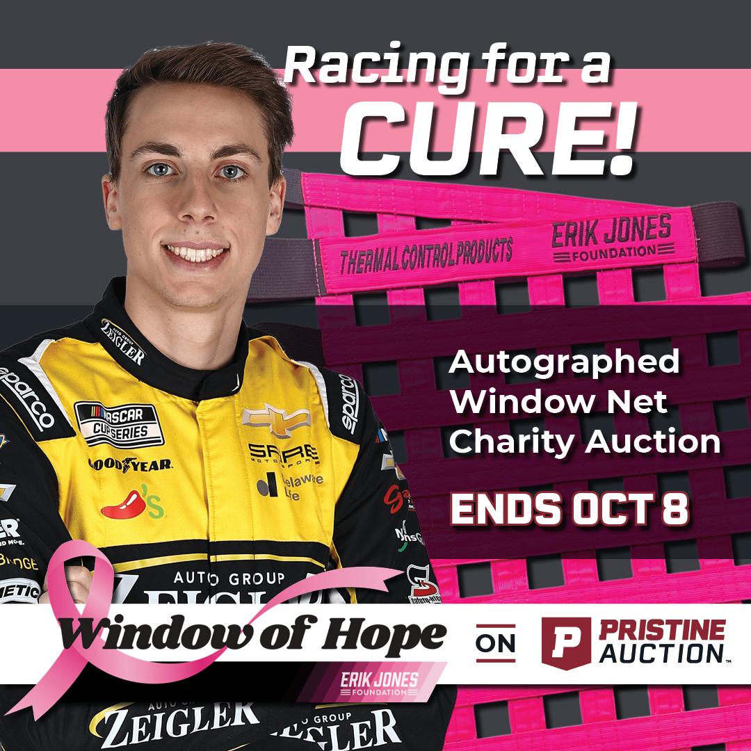 100% of the winning bid benefits the Erik Jones Foundation's Window of Hope program, which funds breast cancer detection and care across the country. The program has expanded each year with full NASCAR Cup Series participation and growing involvement from Xfinity and Truck teams.