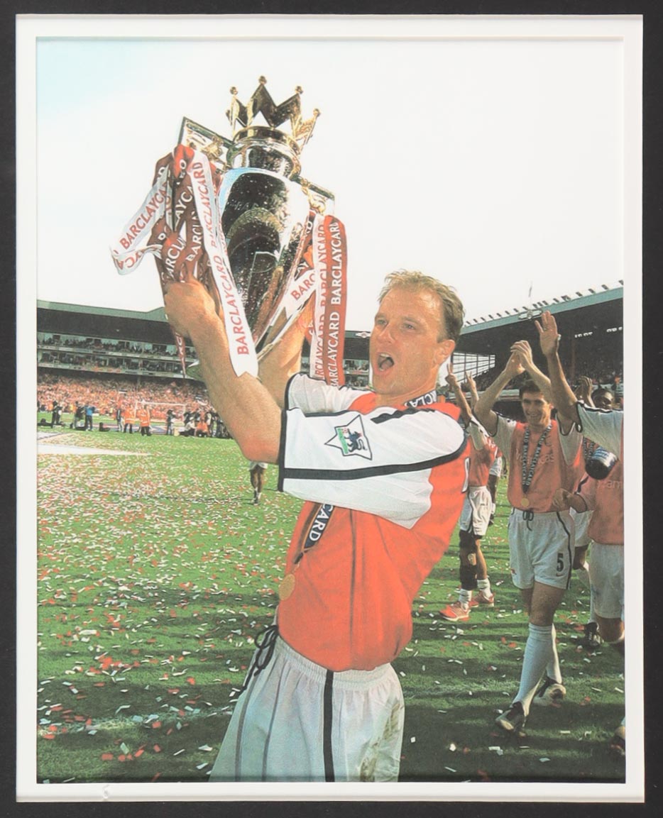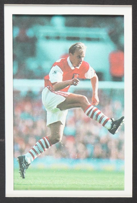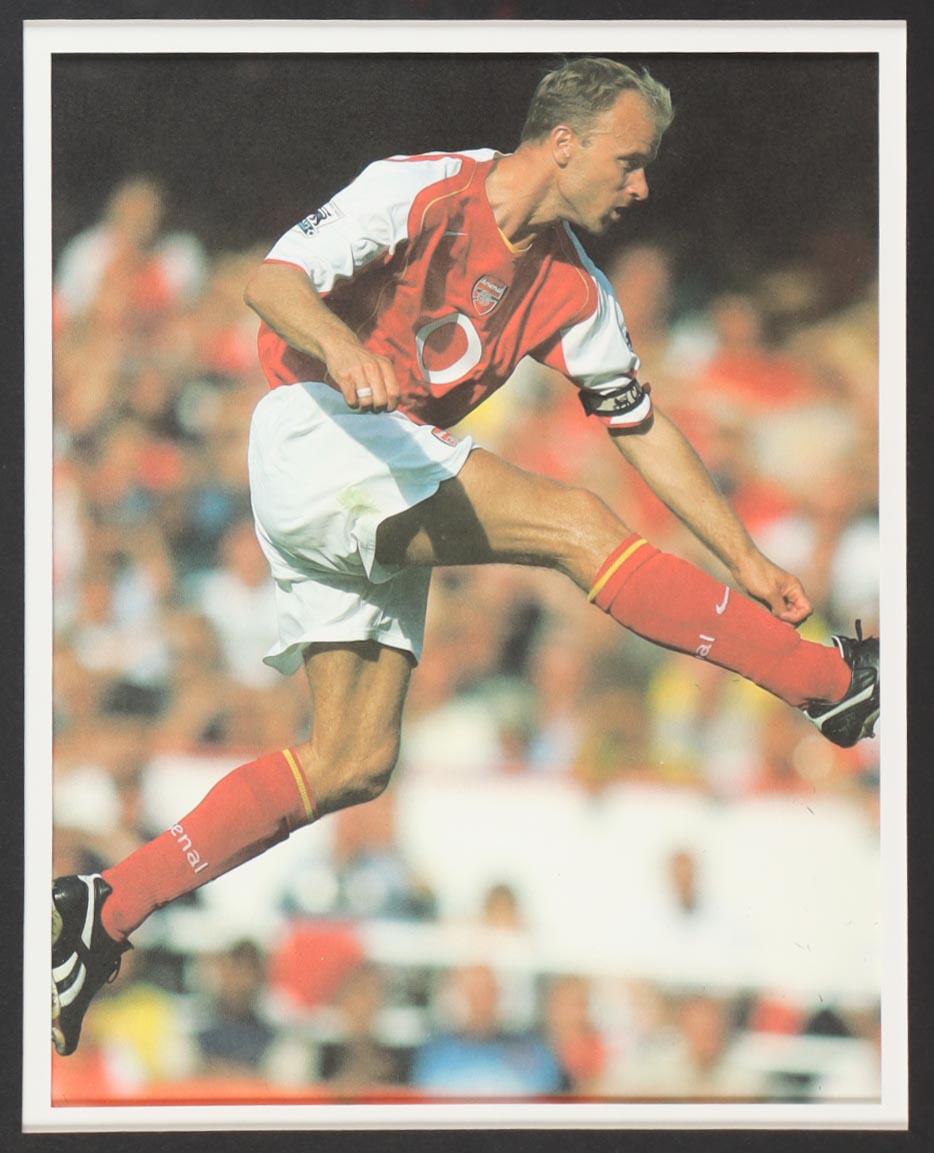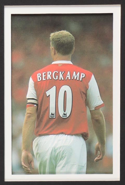 Custom frame measures 34" x 42" in size. Jersey has been hand-signed by Dennis Bergkamp (Arsenal FC). Display also includes (4) unsigned photographs and a team logo patch.