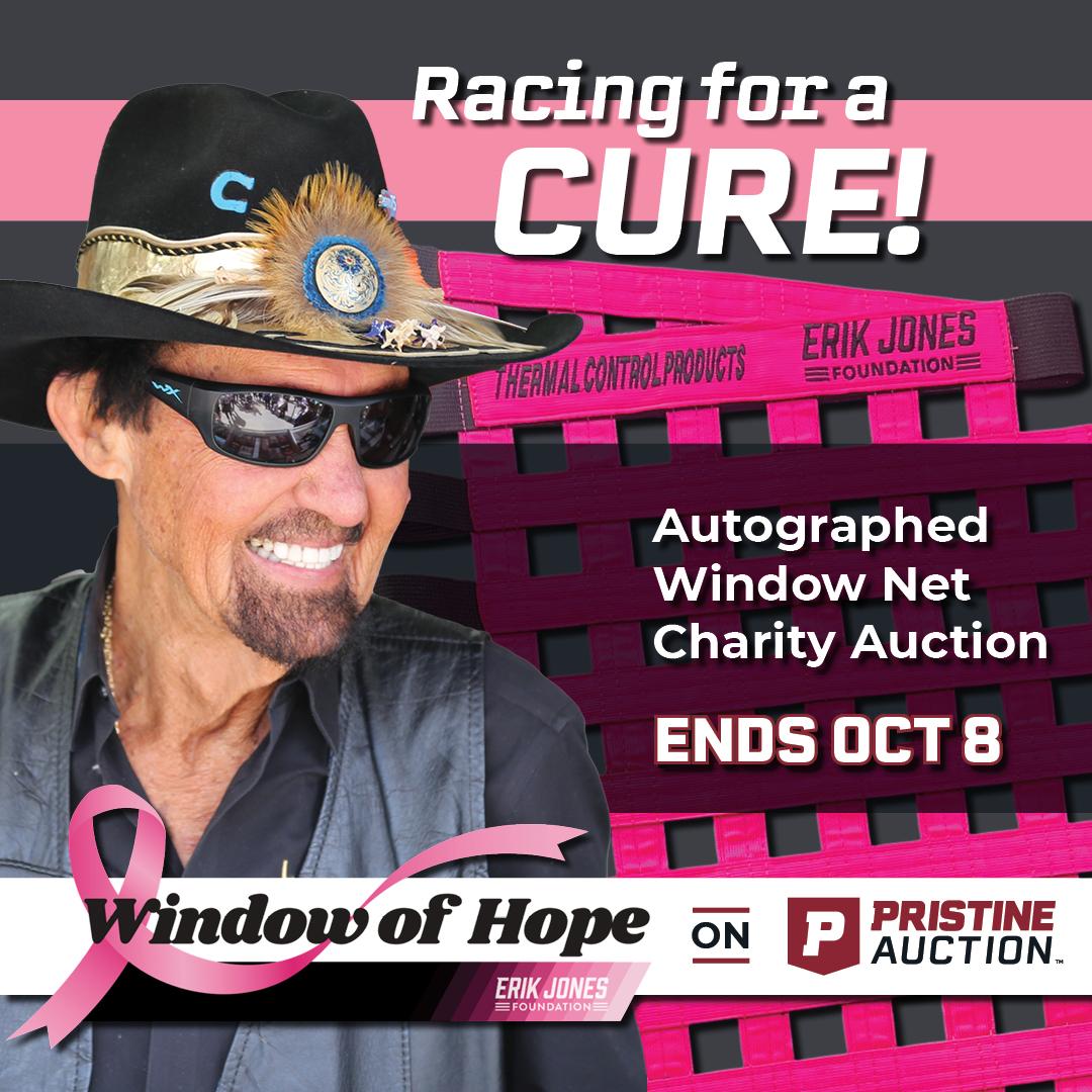 100% of the winning bid benefits the Erik Jones Foundation's Window of Hope program, which funds breast cancer detection and care across the country. The program has expanded each year with full NASCAR Cup Series participation and growing involvement from Xfinity and Truck teams.