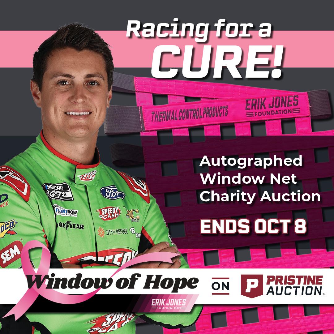 100% of the winning bid benefits the Erik Jones Foundation's Window of Hope program, which funds breast cancer detection and care across the country. The program has expanded each year with full NASCAR Cup Series participation and growing involvement from Xfinity and Truck teams.