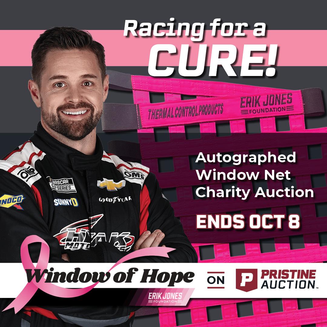 100% of the winning bid benefits the Erik Jones Foundation's Window of Hope program, which funds breast cancer detection and care across the country. The program has expanded each year with full NASCAR Cup Series participation and growing involvement from Xfinity and Truck teams.